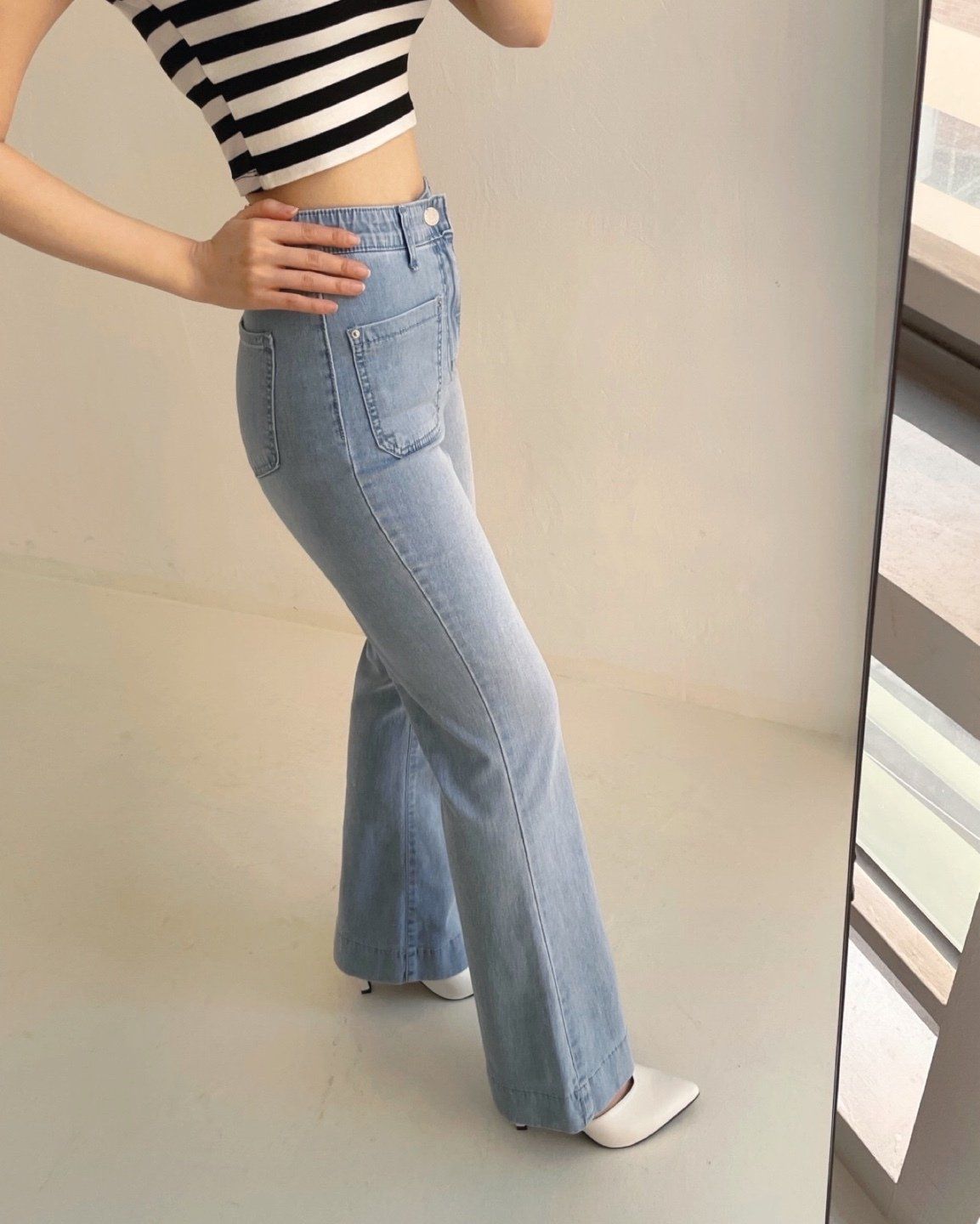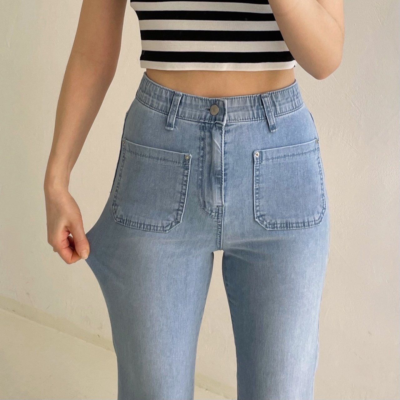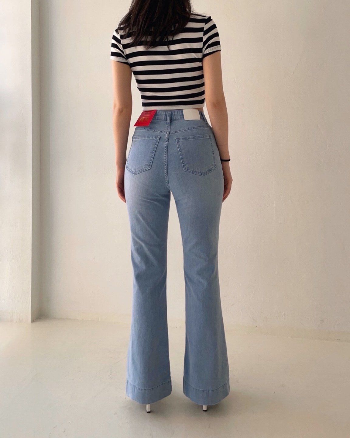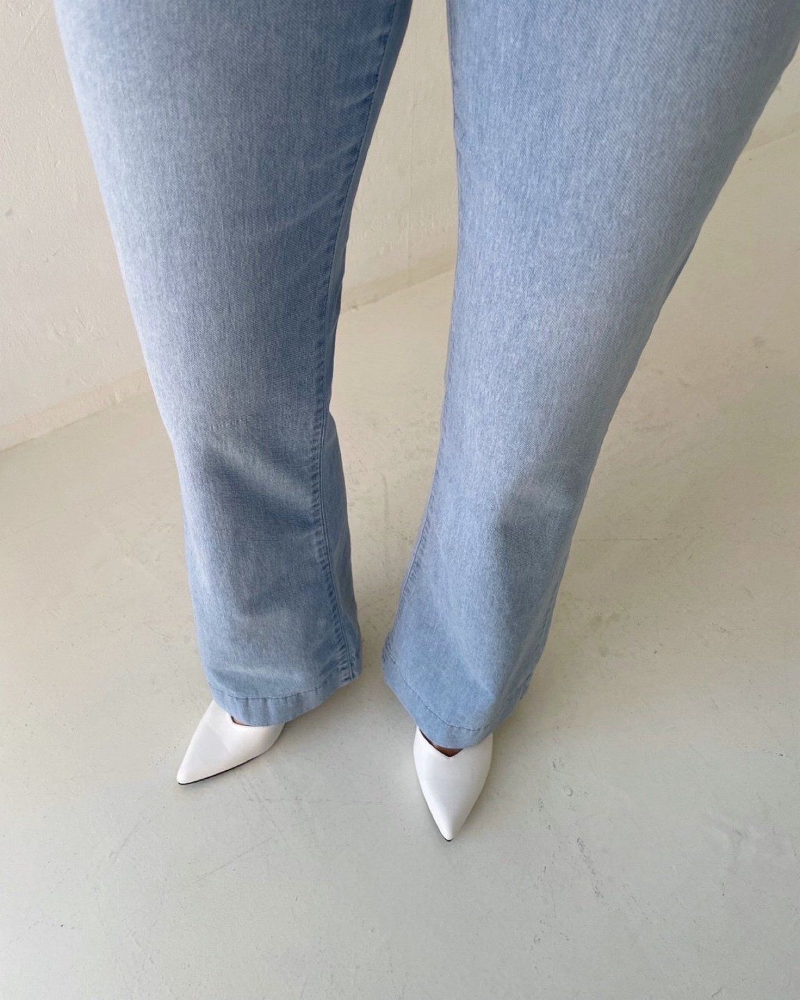 韓國女裝連線 - (涼感機能)彈性腰柔軟丹寧喇叭褲