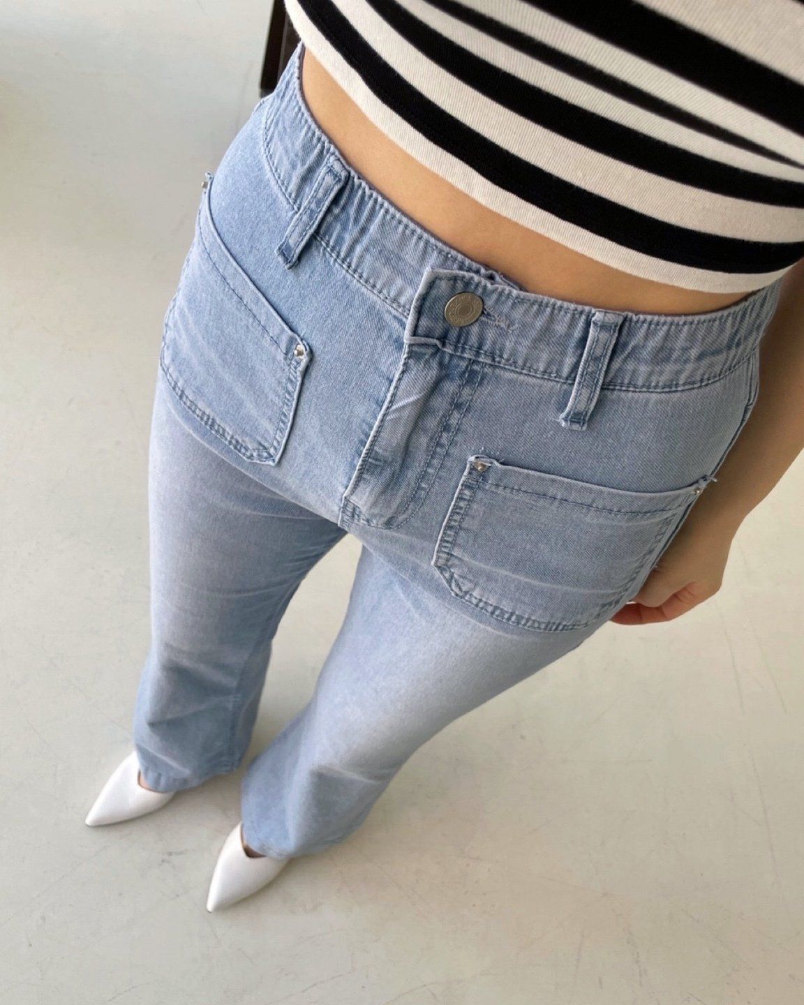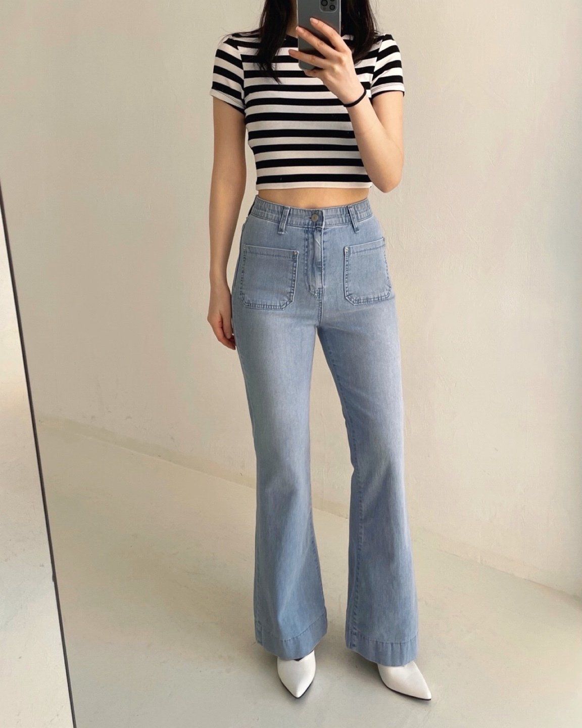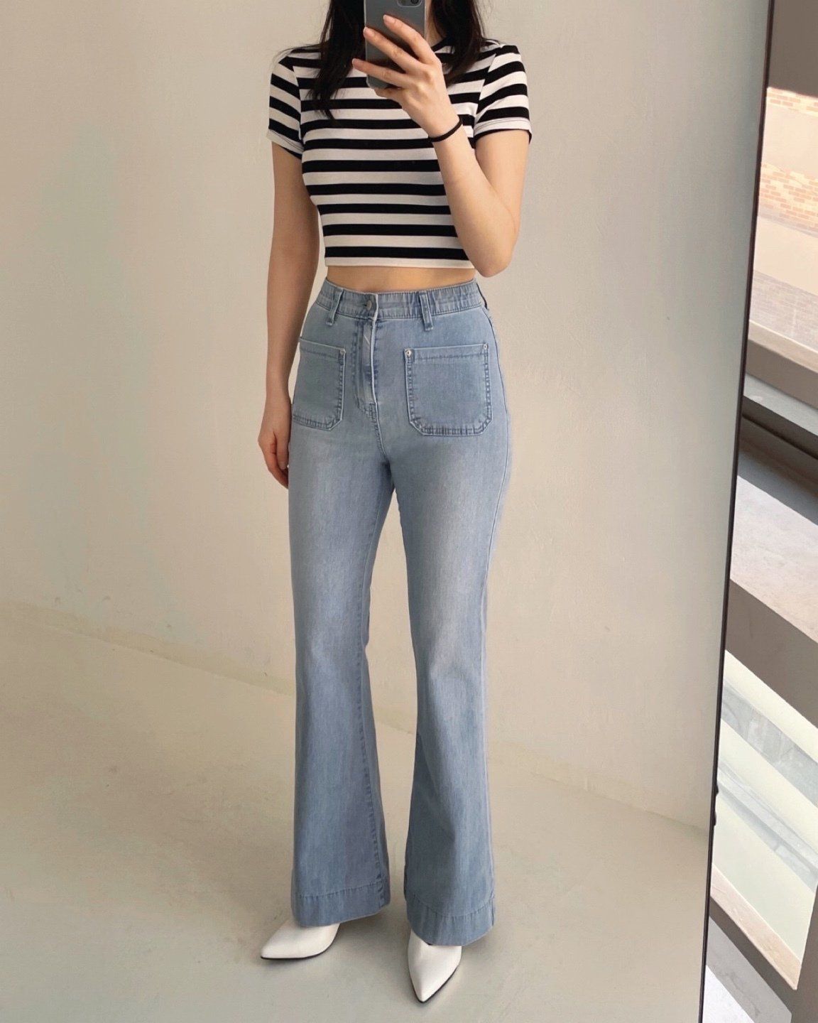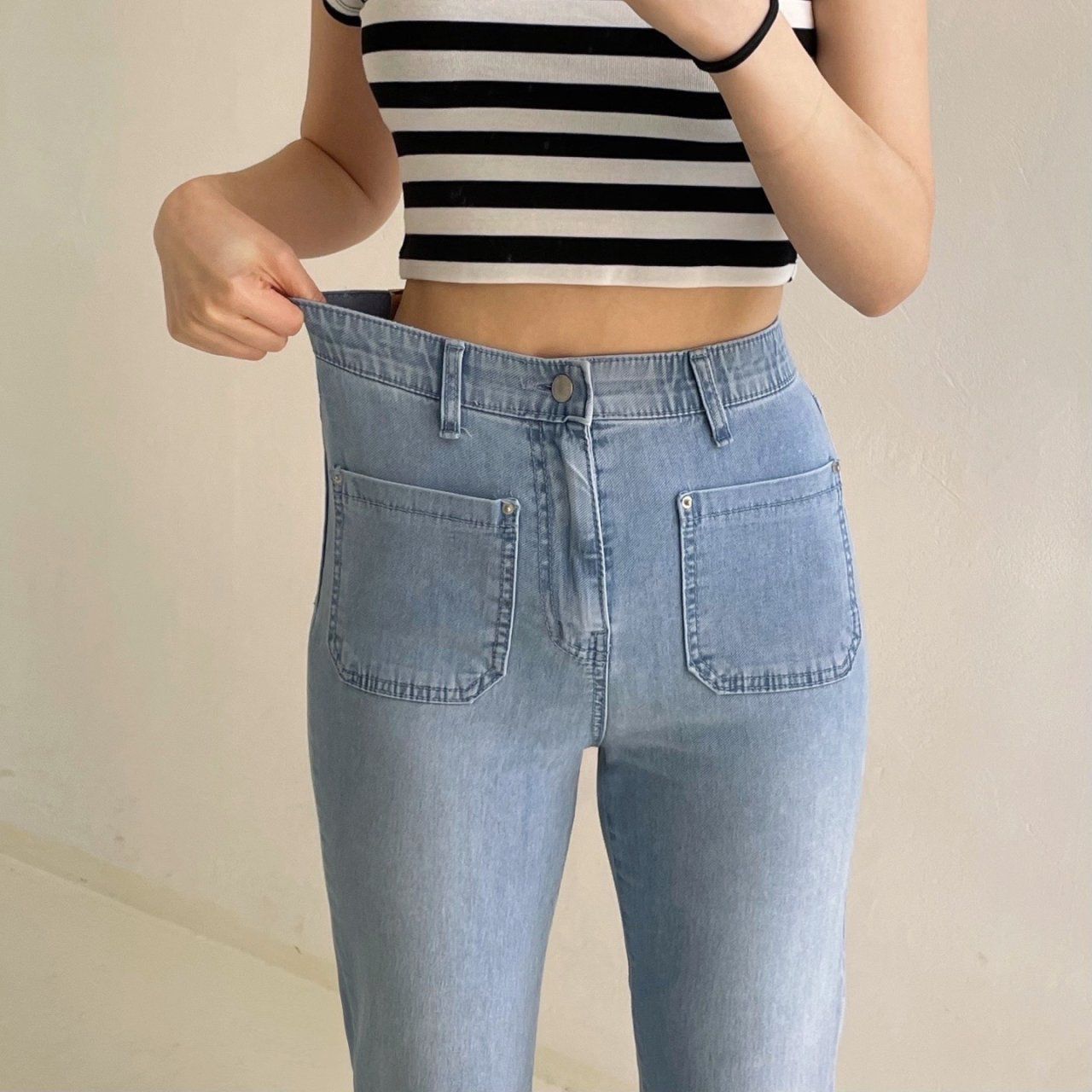 韓國女裝連線 - (涼感機能)彈性腰柔軟丹寧喇叭褲
