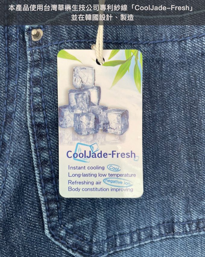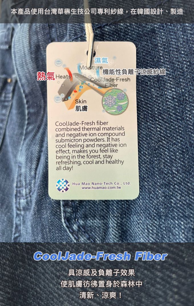 這件褲子採用台灣的華楙生技公司(HUA MAO NANO-TECH CO.,LTD.)專利「Cool Jade-Fresh Ⅲ」負離子涼感紗線在韓國設計、製造,品質保證!