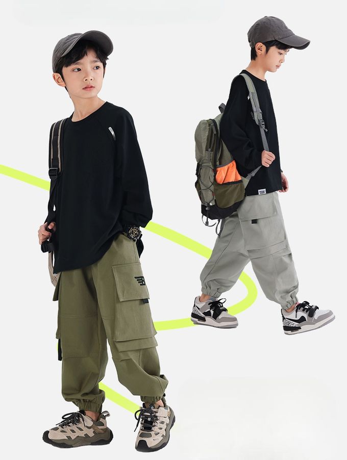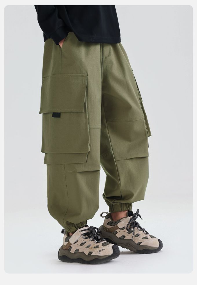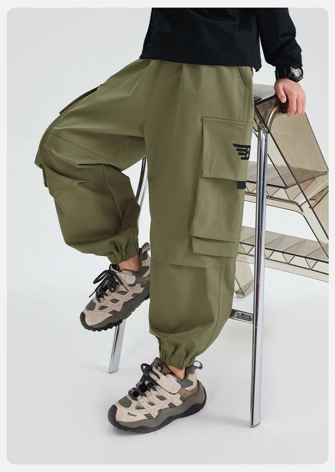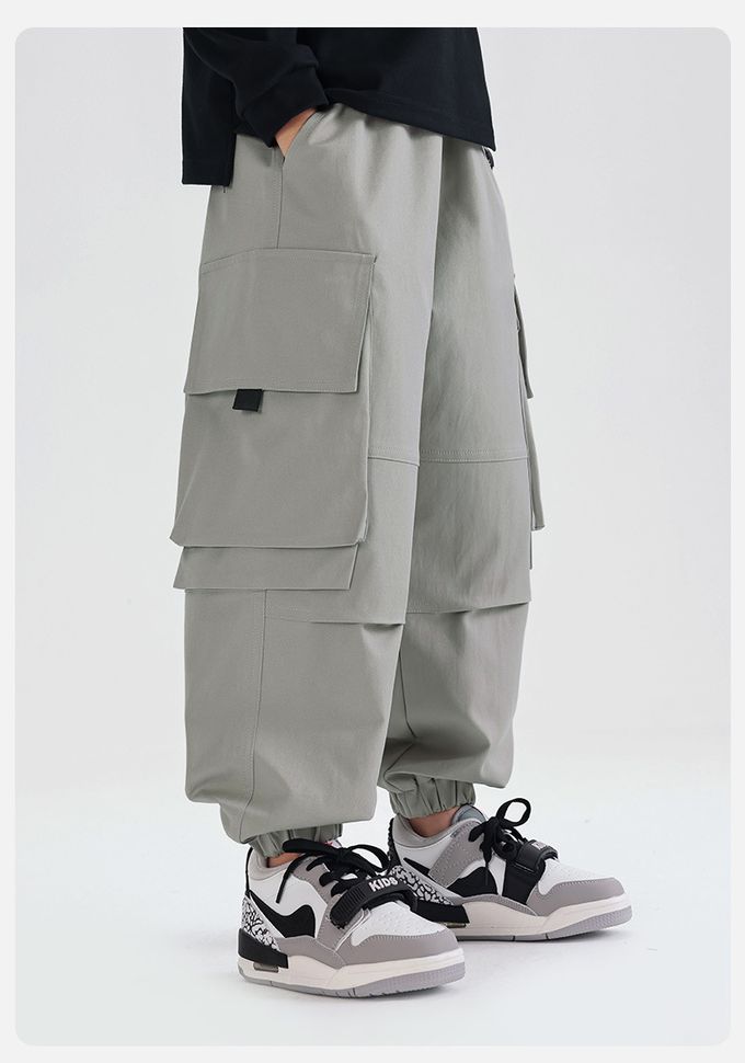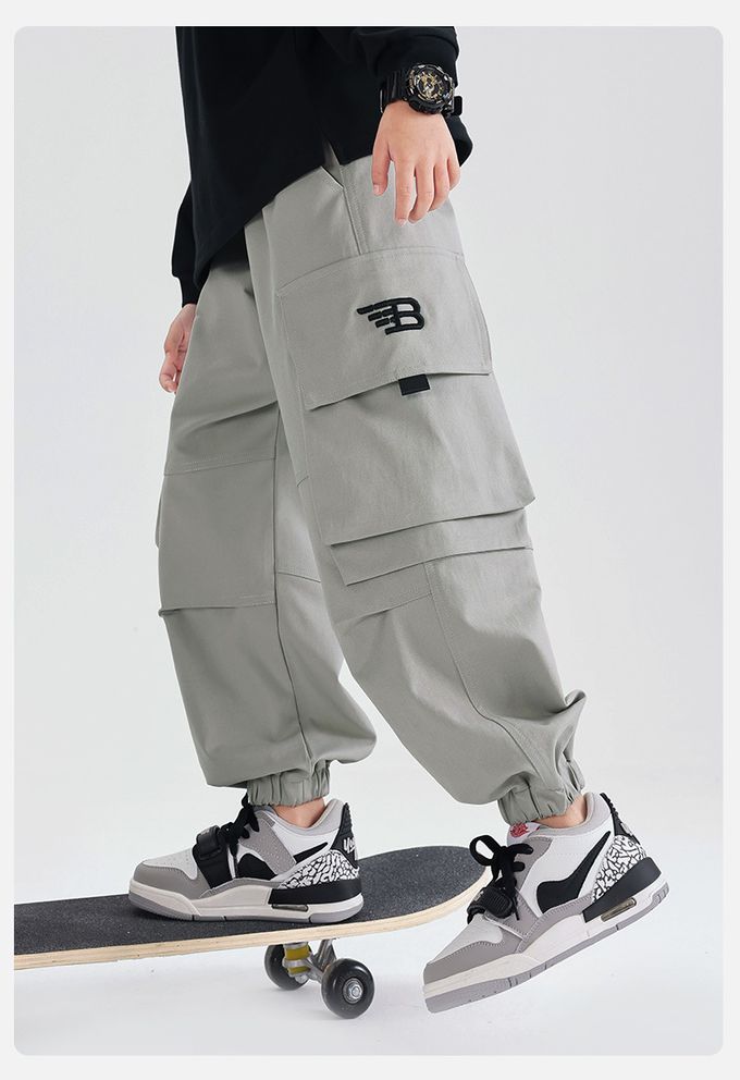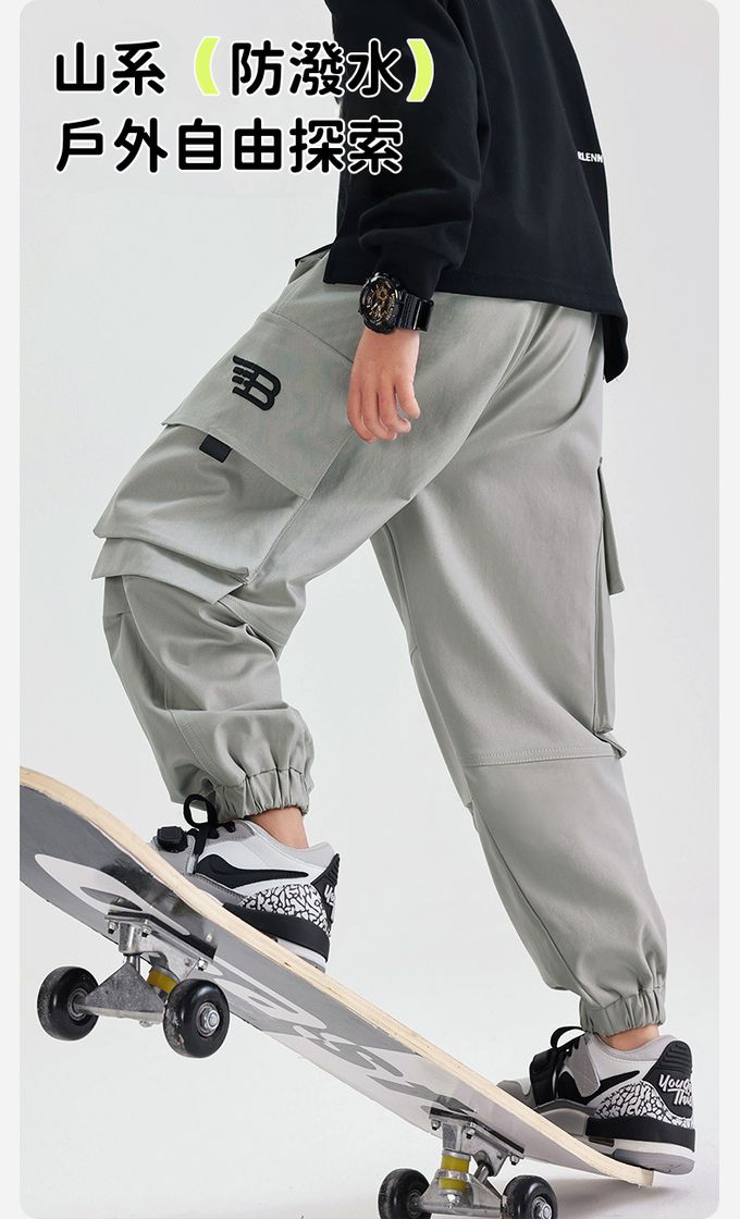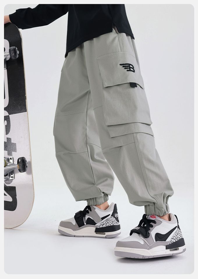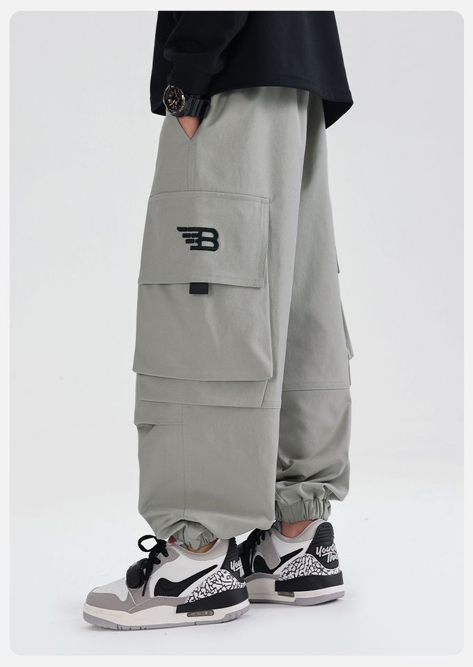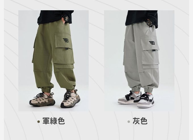 防潑水腰鬆緊休閒運動束口長褲-字母刺繡大口袋-灰色