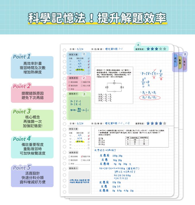 每份有80張26孔活頁紙,可按照「科目」、「單元」排序,隨時增添頁數,分科、分類讓不同學科之間複習更有系統