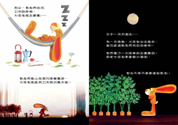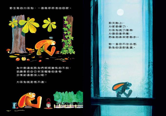 不,他沒想到,最後大家都來幫助他。大耳兔不只在庇護所待了下來,和大家一起順利度過冬天,也在這段期間跟著野兔們一起體會到助人的意義和樂趣。更令大耳兔驚喜意外的是--在大家的齊心協力下,他竟然在隔年春天重新得回了一片大頭菜田!