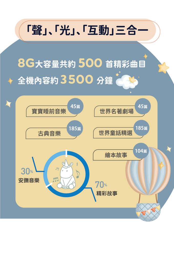此商品沒有中英文兒歌,也無法連藍芽,有點可惜。但實品有質感、又能當音樂盒放八音盒音樂(音樂旋律好聽,是moon river)若孩子習慣聽故事不用搭配看圖畫繪本,值得購買