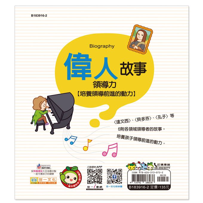 本書含<達文西>.<貝多芬>.<孔子>等6則偉人故事,故事情節簡單有趣,圖畫生動 活潑,隨書附內容音檔QR CODE,讓孩子容易閱讀之虞,也能體驗聽故事的樂趣,透 過故事讓孩子認識各領域偉大領導者們的生平背景,並讓孩子學習偉人們領導前進的動力.