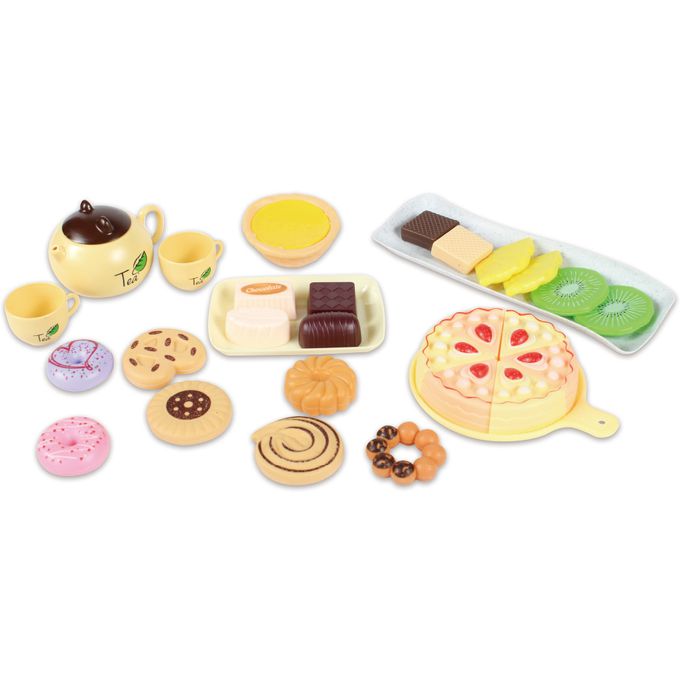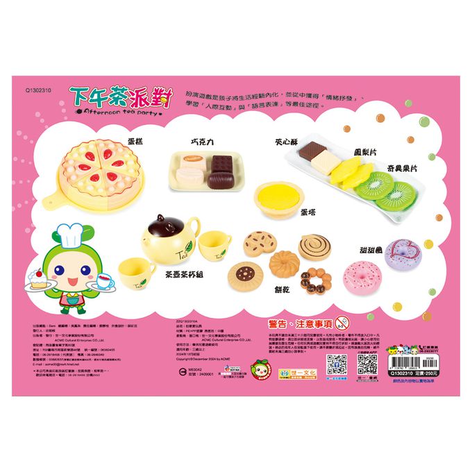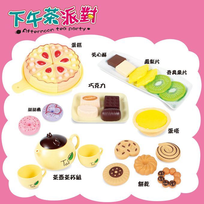 本產品包含茶壺茶杯組,美味的蛋糕,水果切片,各式各樣可口的甜點及餐盤,可以享受扮演樂趣,一起舉辦一場悠閒舒適的下午茶時光.