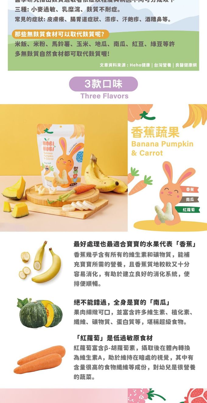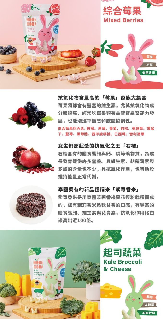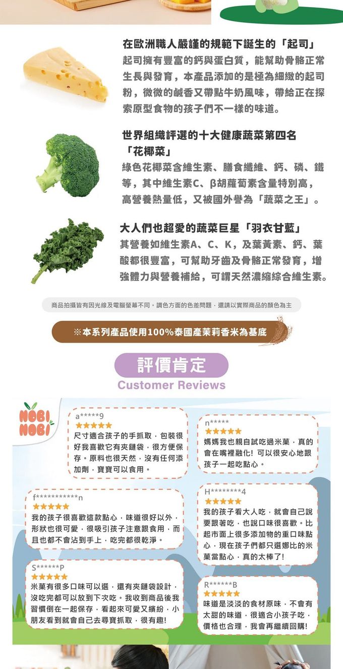 成分:茉莉香米、蔗糖、花椰菜、起司粉、羽衣甘藍、鹽、碳酸鈣、維生素E (抗氧化劑)、複合式維生素(維生素B1、鐵)