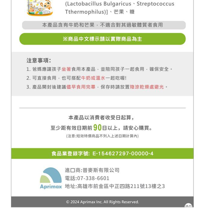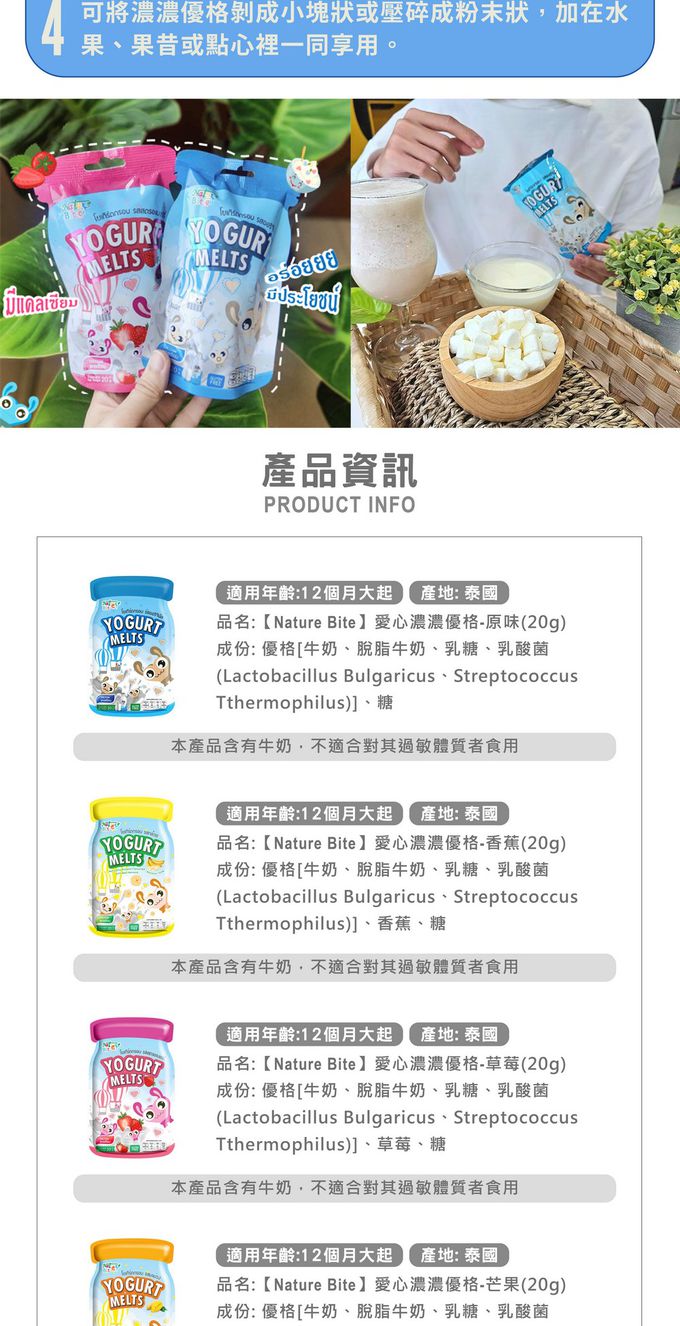 成分:優格[牛奶、脫脂牛奶、乳糖、乳酸菌(Lactobacillus Bulgaricus、Streptococcus Tthermophilus)]、糖