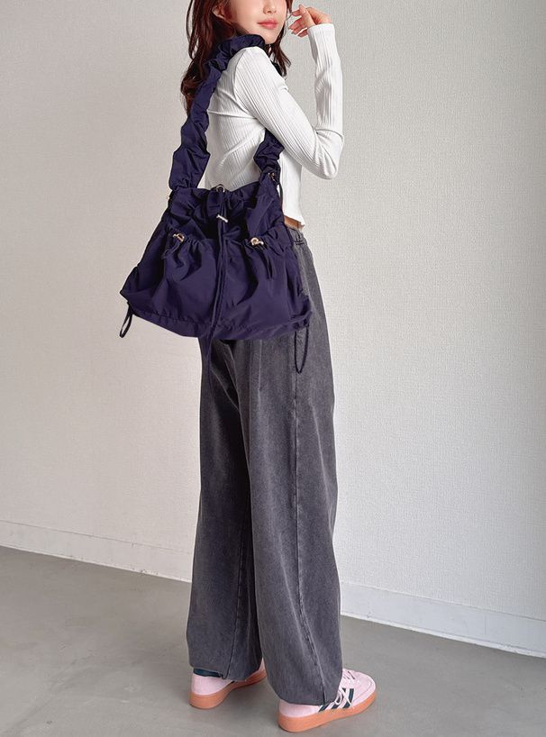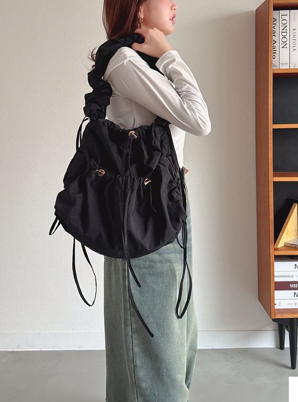 日本 GRL - 甜美皺摺率性抽繩肩背包-黑 (F)