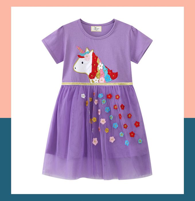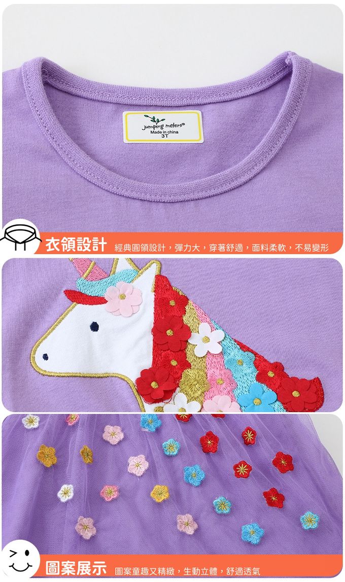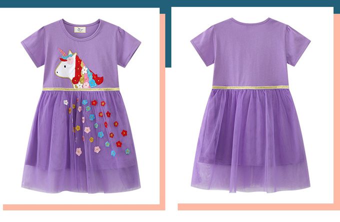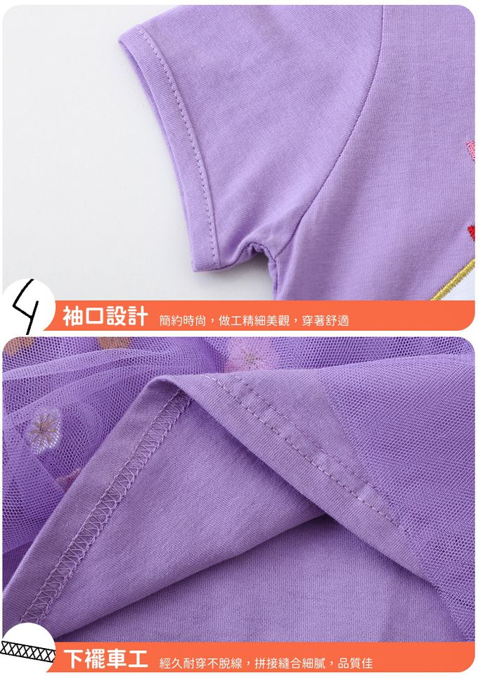 棉質圓領短袖網紗洋裝-繽紛花卉獨角獸-紫色