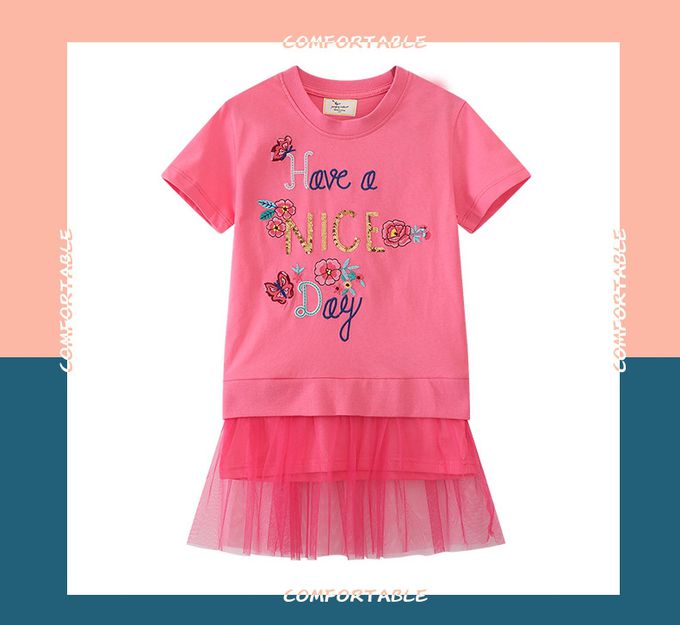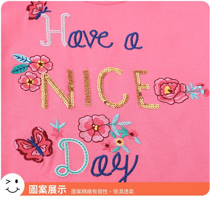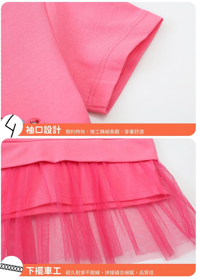 棉質圓領短袖網紗洋裝-亮片刺繡標語-粉色