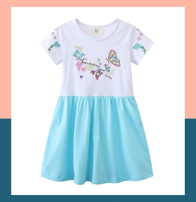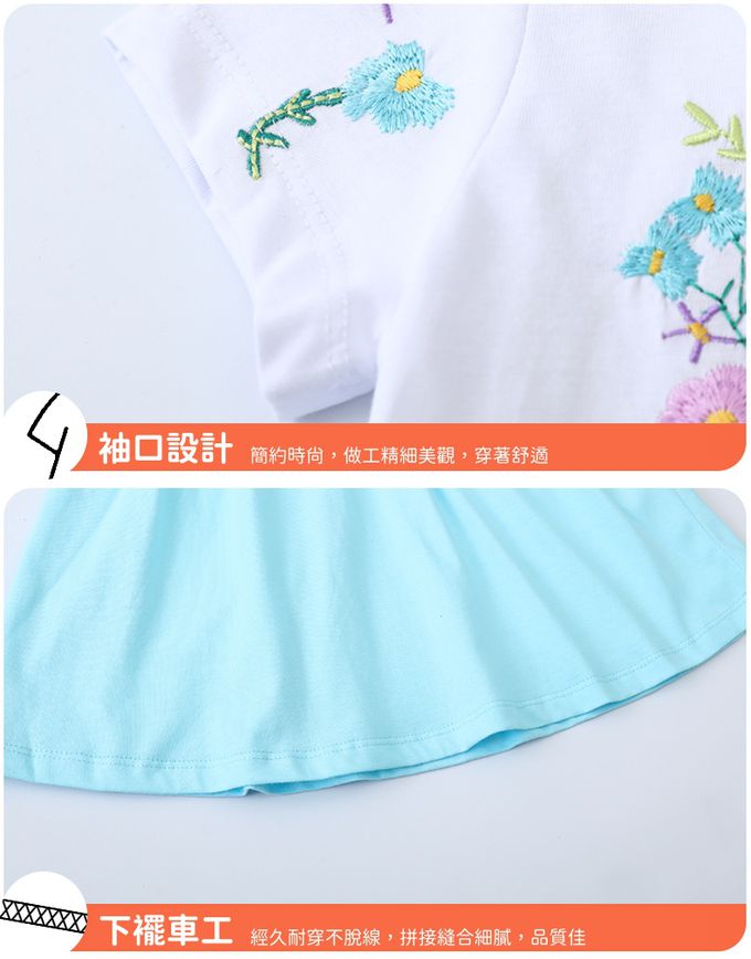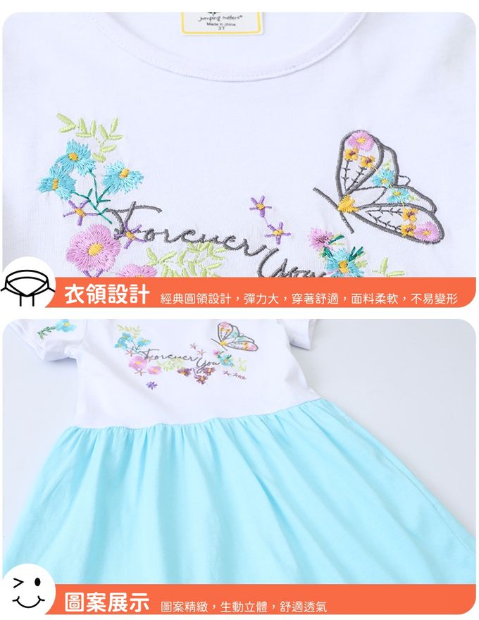 棉質圓領短袖洋裝-花卉蝴蝶-白+藍