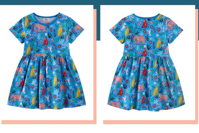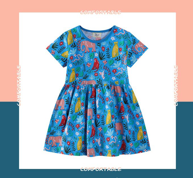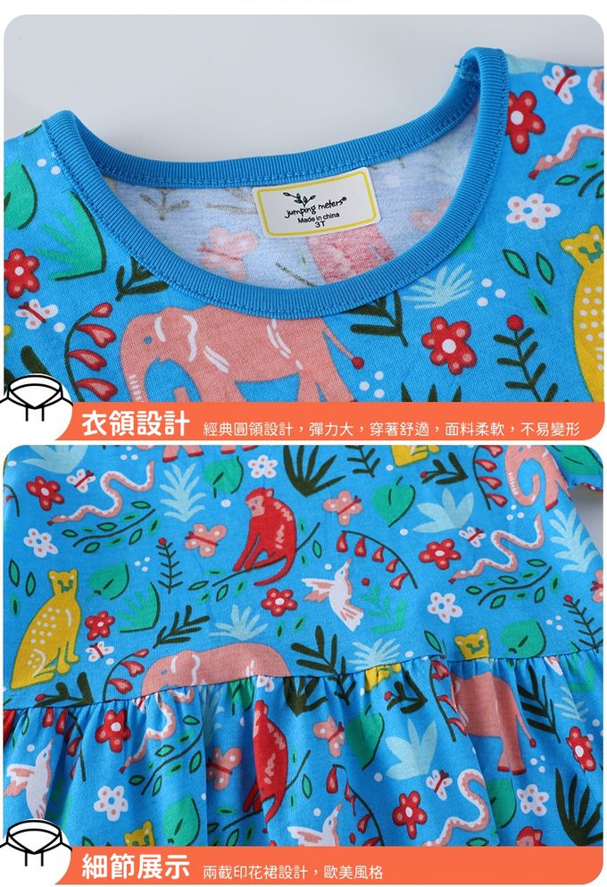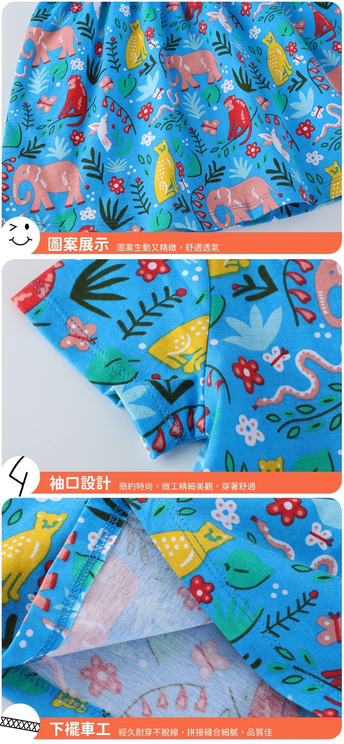 棉質圓領短袖洋裝-滿版動物花卉-藍色
