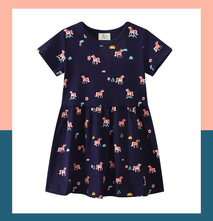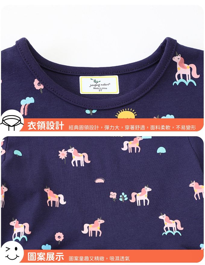 Jumping meters - 棉質圓領短袖洋裝-彩虹獨角獸-深藍色