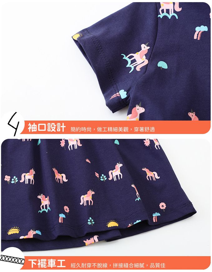 棉質圓領短袖洋裝-小小獨角獸-藏青