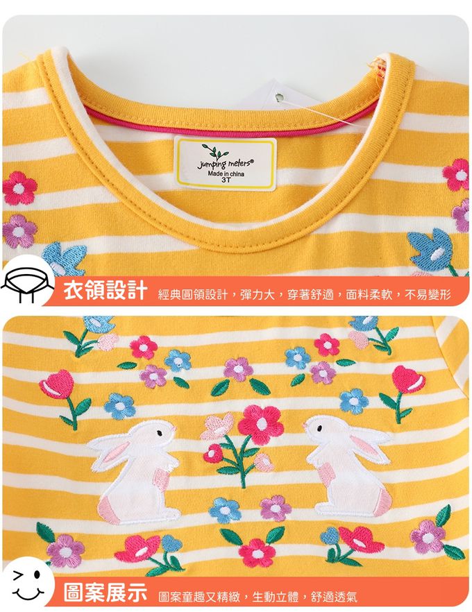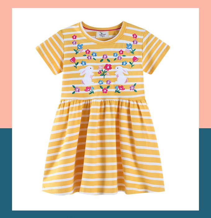 Jumping meters - 棉質圓領短袖洋裝-兔子花卉-黃色條紋