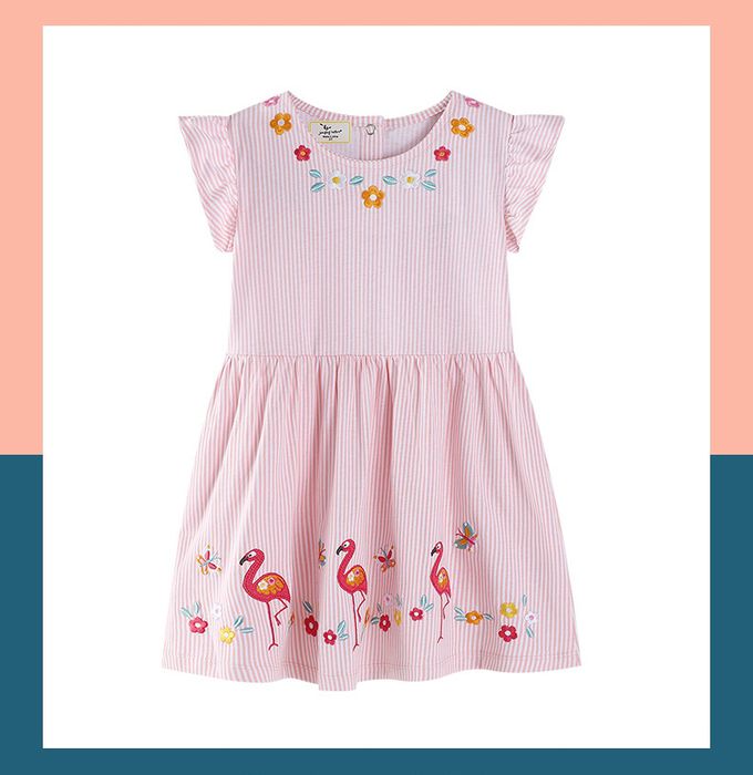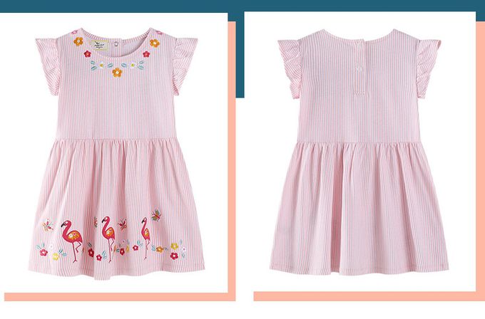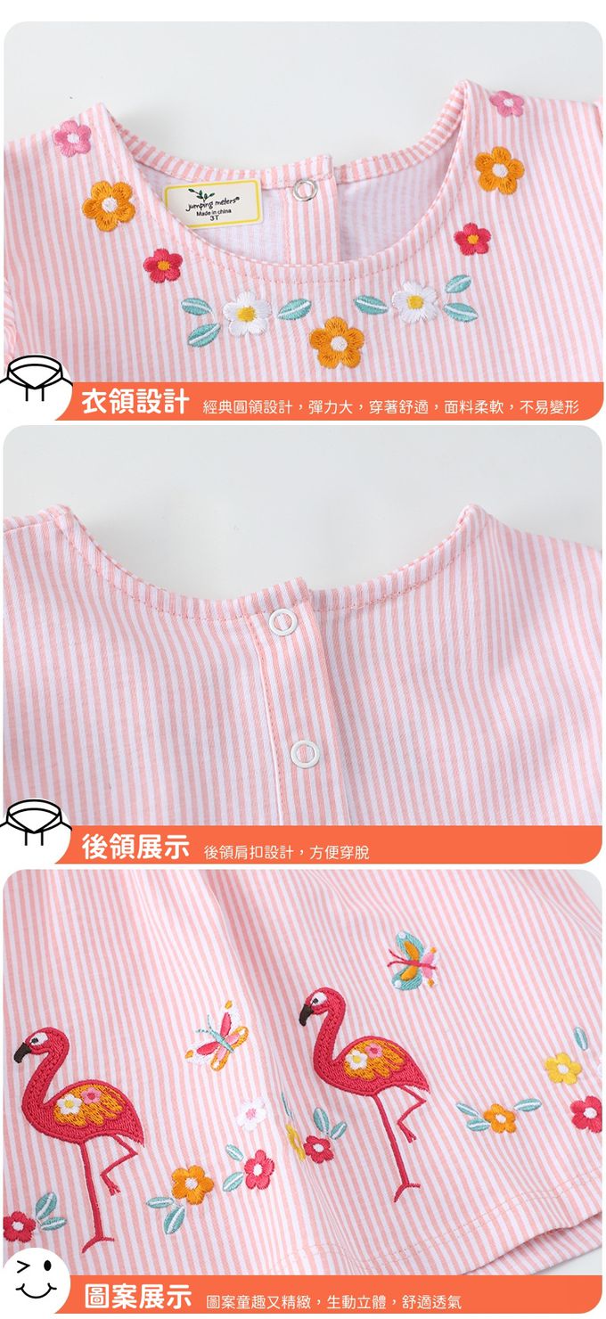 Jumping meters - 棉質圓領小飛袖洋裝-花朵紅鶴-粉色條紋