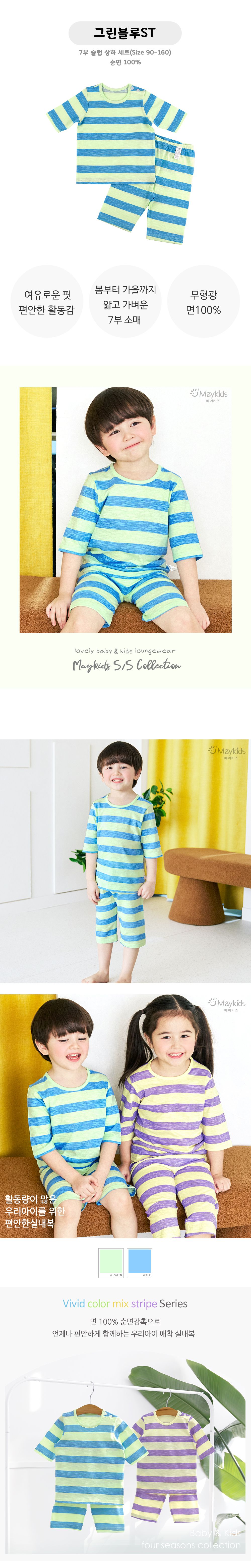 韓國 Maykids - 輕薄細柔棉七分袖家居服-寬條紋-藍X綠