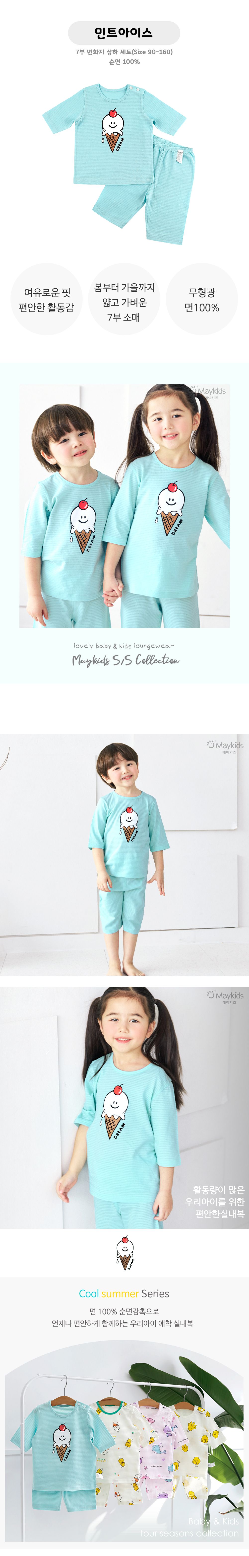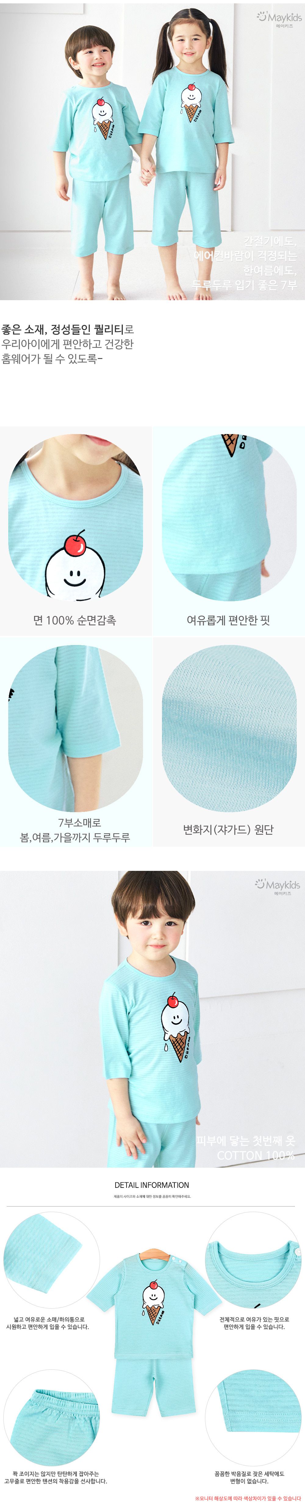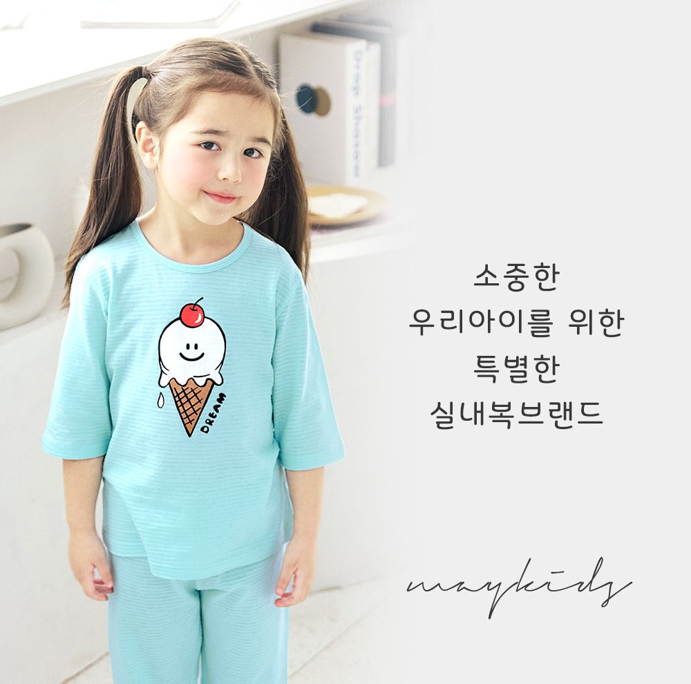韓國 Maykids - 透氣條紋提花棉七分袖家居服-櫻桃甜筒-薄荷藍