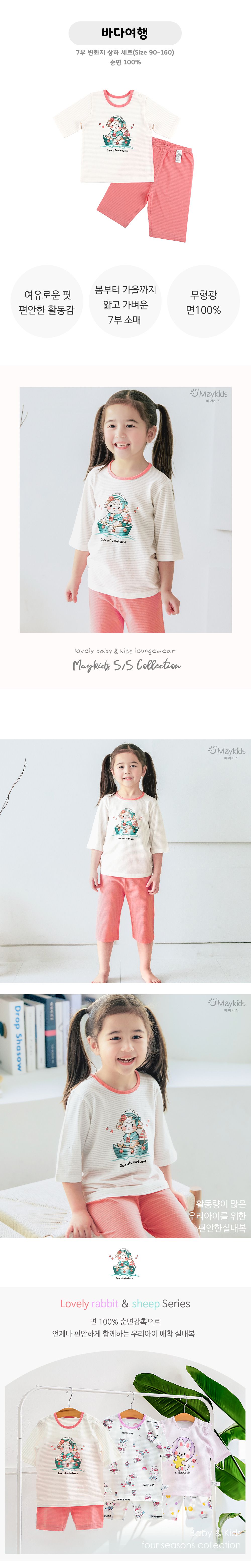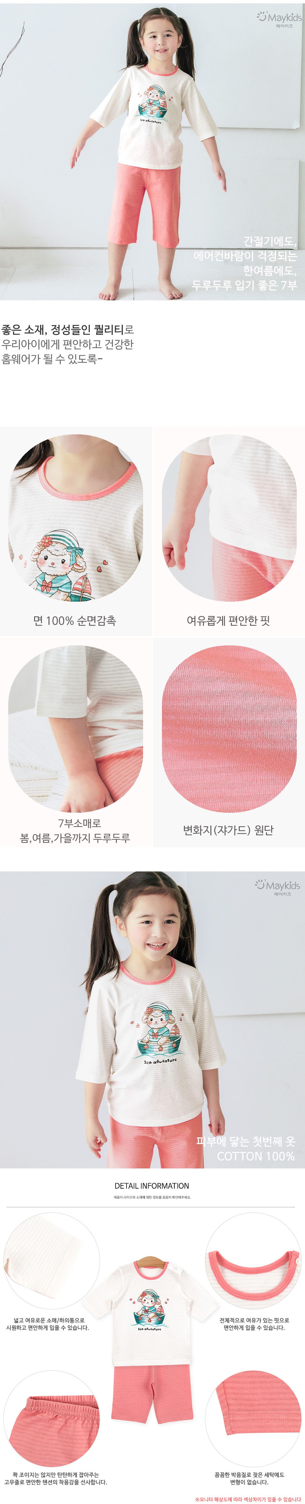 韓國 Maykids - 透氣條紋提花棉七分袖家居服-羊咩咩-米白X粉