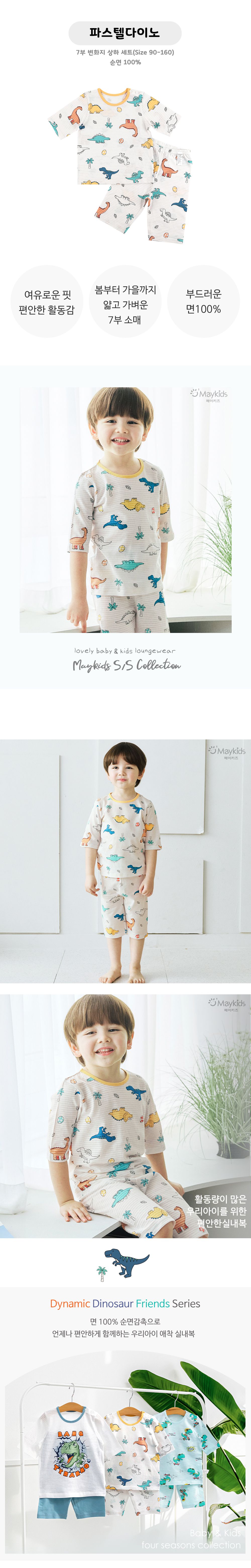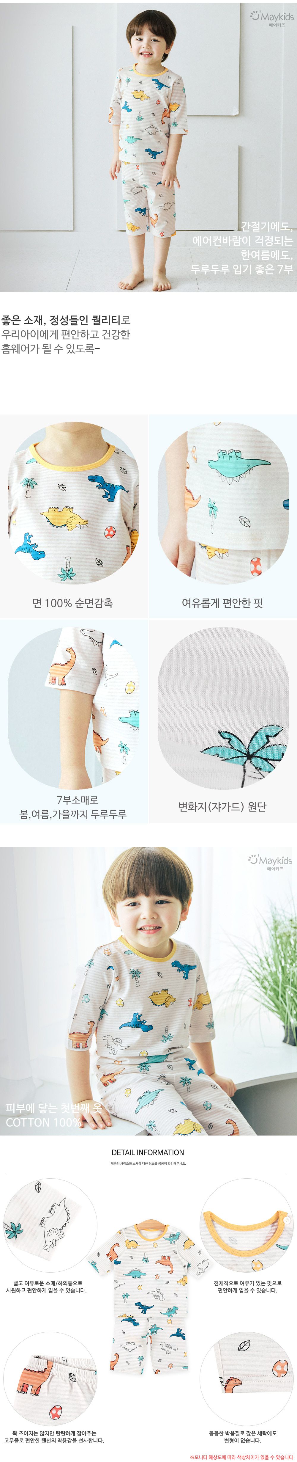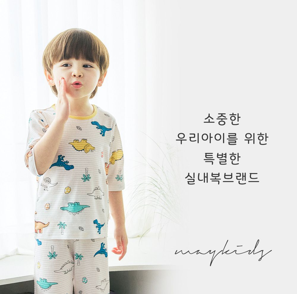 韓國 Maykids - 透氣條紋提花棉七分袖家居服-萌萌恐龍