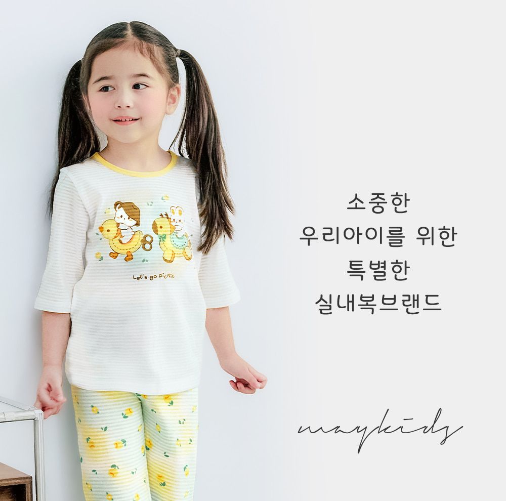 韓國 Maykids - 透氣條紋提花棉七分袖家居服-格紋小鴨-黃