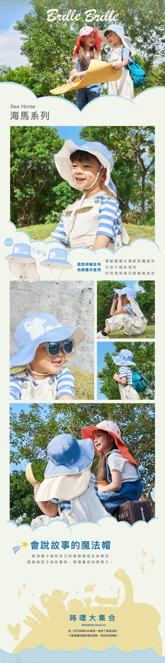 《海馬系列Sea Horse》頸部防護兒童防曬帽 (可收放型) -咘哩大集合UPF50+-禮盒包裝、頭圍46-56cm (3-10歲)