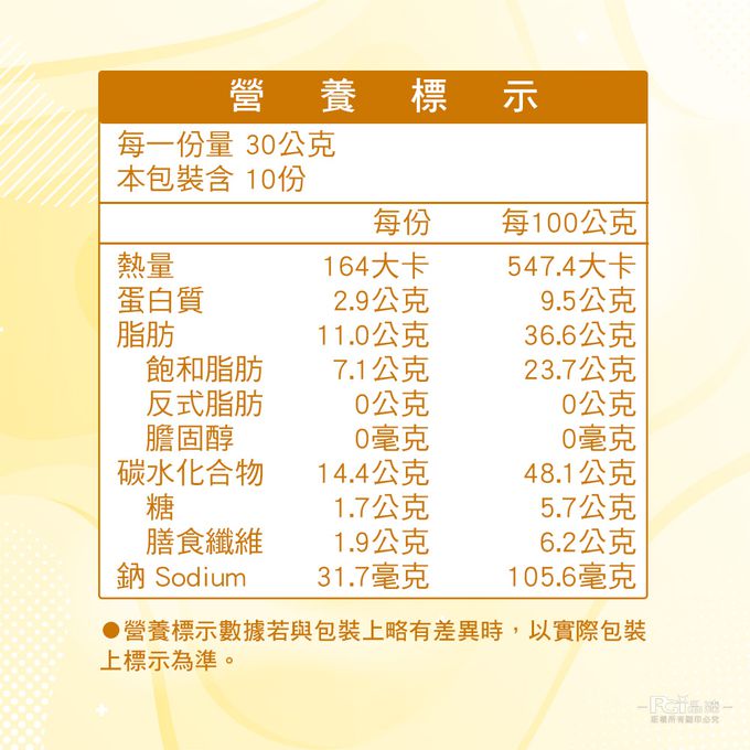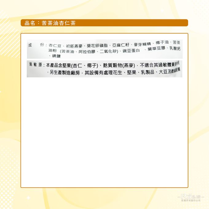 過敏原:本產品含堅果(杏仁、椰子)、麩質穀物(燕麥),不適合其過敏體質者食用,另生產製造廠房,其設備有處理花生、堅果、乳製品、大豆及麩質穀類