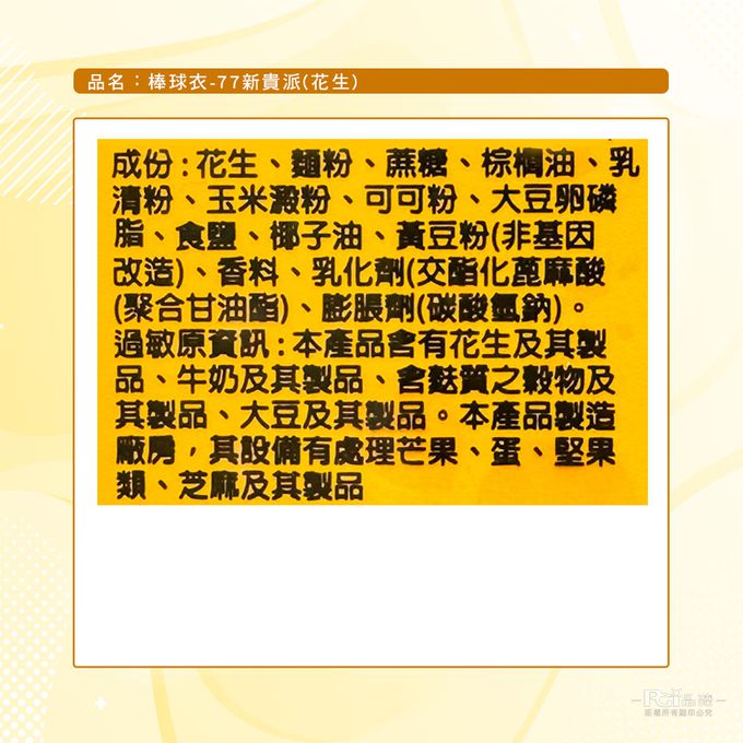 過敏原:77新貴派:本產品含有花生及其製品、牛奶及其製品、含麩質之穀物及其製品、大豆及其製品。本產品製造廠房,其設備有處理芒果、蛋、堅果類、芝麻及其製品 77乳加巧克力:本產品含有花生及其製品、牛奶及其製品、大豆及其製品。本產品製造廠房,其設備有處理芒果、蛋、堅果類、芝麻、舎麩質之穀物及其製品。