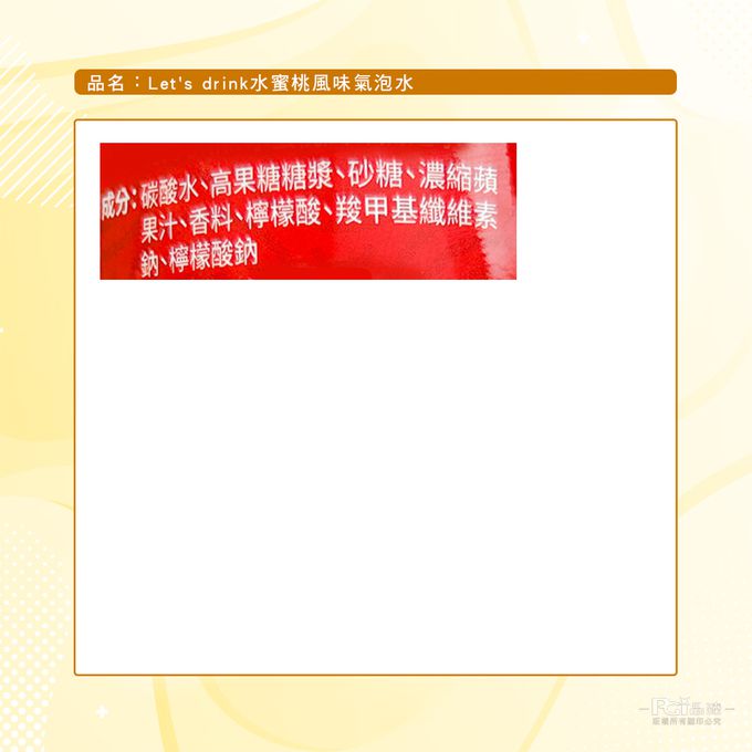 成分:碳酸水、高果糖糖漿、砂糖、濃縮蘋果汁、香料、檸檬酸、羧甲基纖維素鈉、檸檬酸鈉