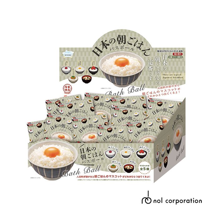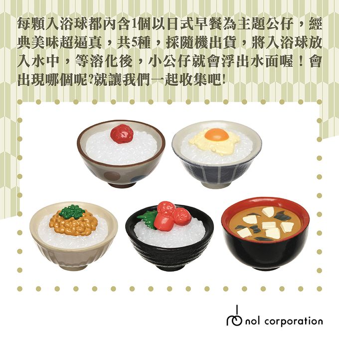 每顆入浴球都內含1個日式早餐小公仔,共5種,採隨機出貨,將入浴球放入水中,等溶化後,小公仔就會浮出水面喔!會出現哪個呢? ,就讓我們一起收集吧!
