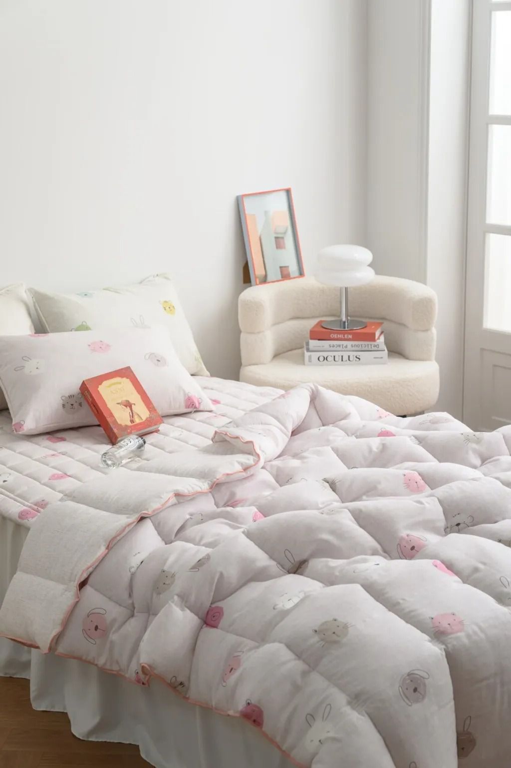 傳統被子填充都偏厚重!夏天只蓋一點點容易一翻身就著涼,冬被厚厚一層蓋上去彷彿中了定身咒 OTZ 總是有一種被束縛著的感覺,睡覺也好有負擔啊!但韓國被子普遍輕盈、觸感手感都很好,不怕不好翻身。