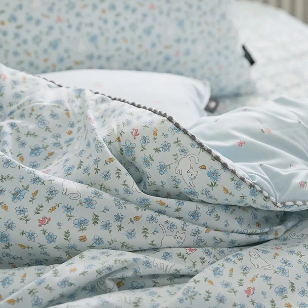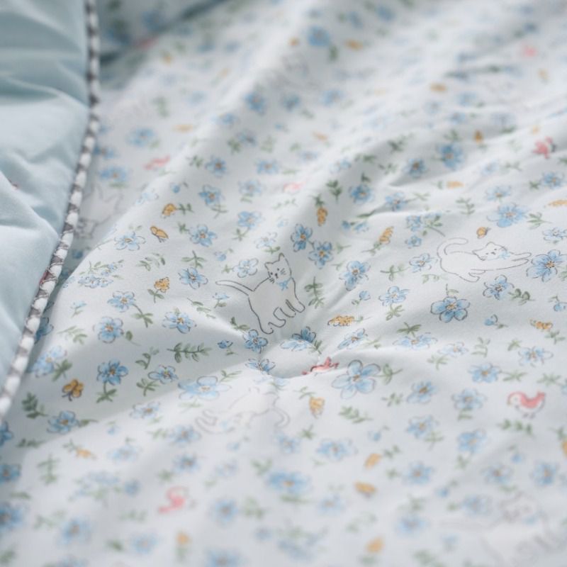 韓國棉被代購 - 廣藏市場 可水洗半微纖維四季薄被-花漾貓咪-天藍 (單人/單人加大被[150X200cm])