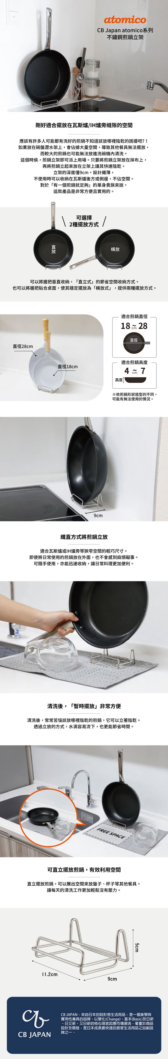 此款煎鍋立架,輕巧造型尺寸適合擺放在瓦斯爐或IH爐旁狹窄空間,不僅適合將煎鍋立放,也適合橫放,依據空間大小您可以自行調整擺放方式。可隨手取得使用,亦能迅速收納,讓日常料理更加便利。