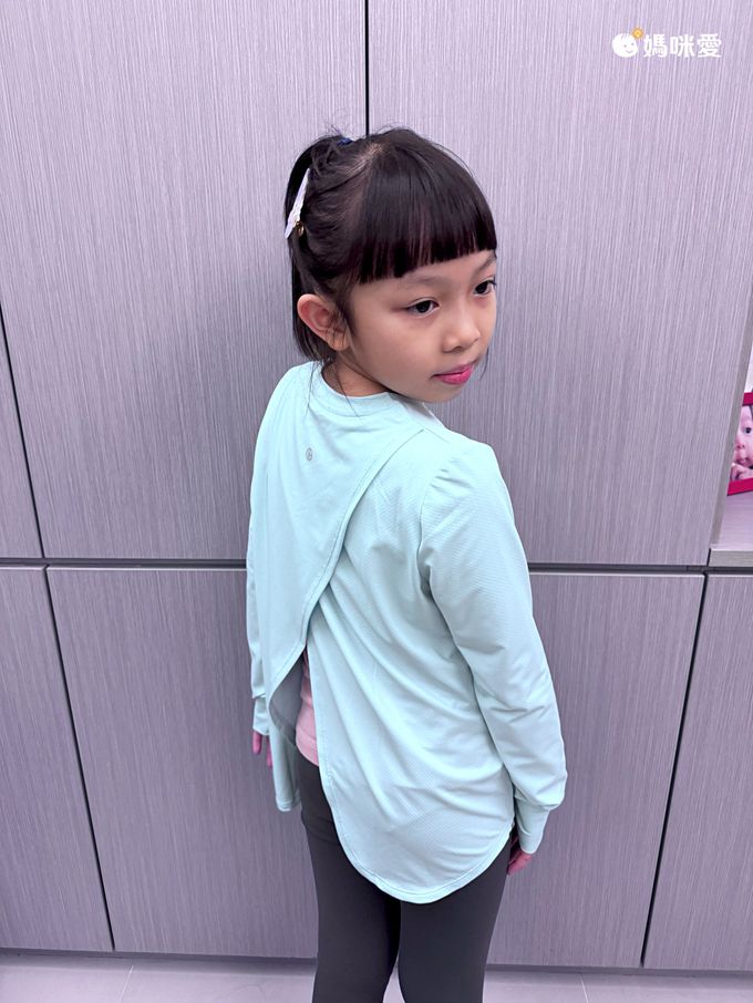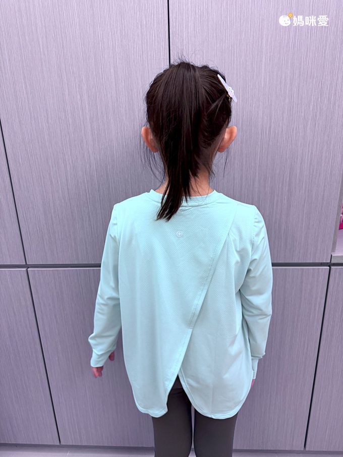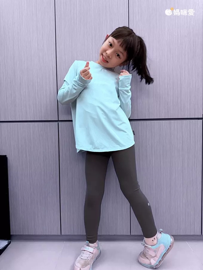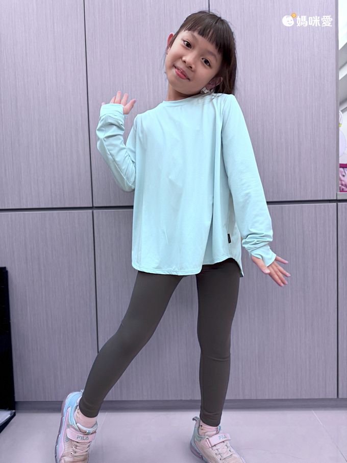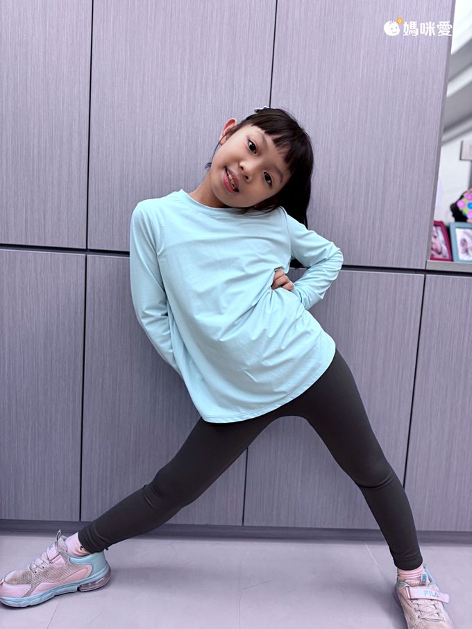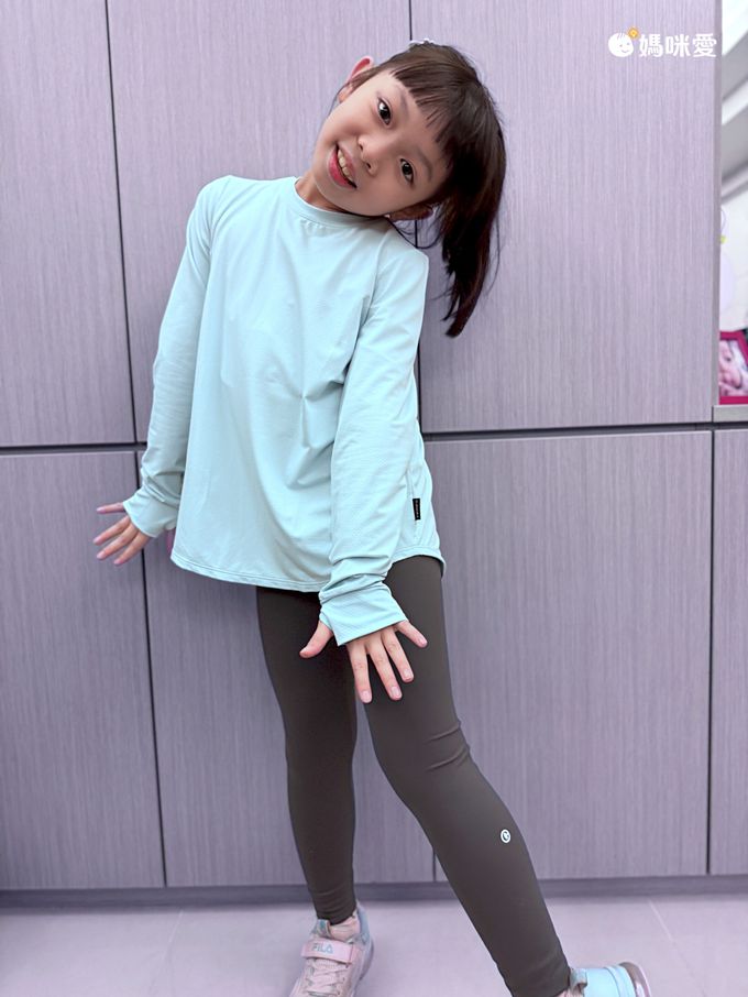安安身上穿的衣服是UPF50+防曬涼爽後開衩長袖上衣,褲子是專為兒童設計彈力瑜珈褲/鯊魚褲(深灰色)。穿上後非常舒適,開心地表演各種運動姿勢~
