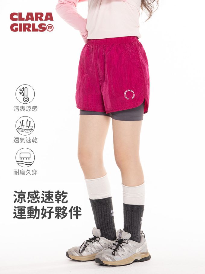 吸濕排汗速乾假兩件運動短褲-玫紅色