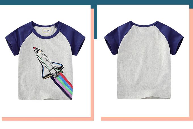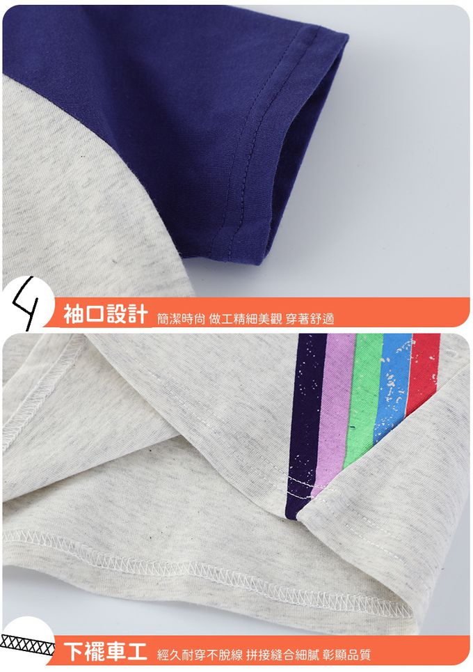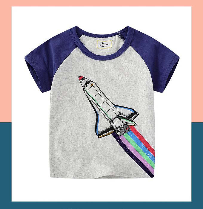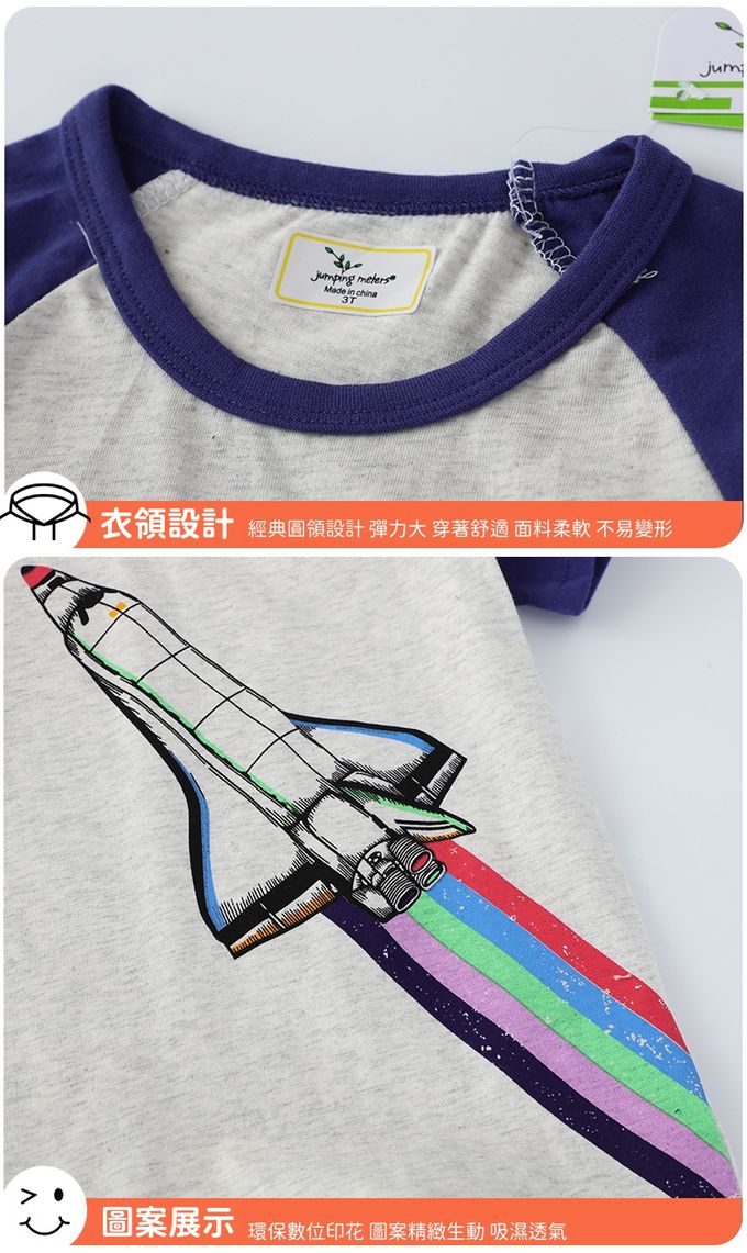 棉質圓領短袖上衣-彩色火箭-拼色灰