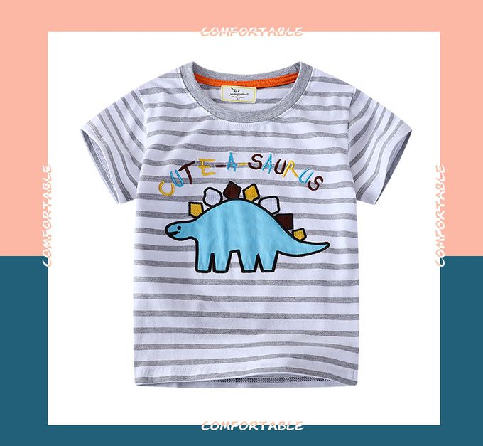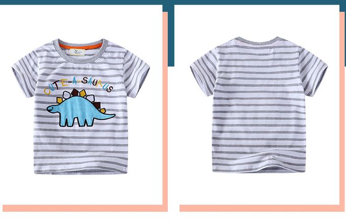 棉質圓領短袖上衣-可愛恐龍-灰色條紋