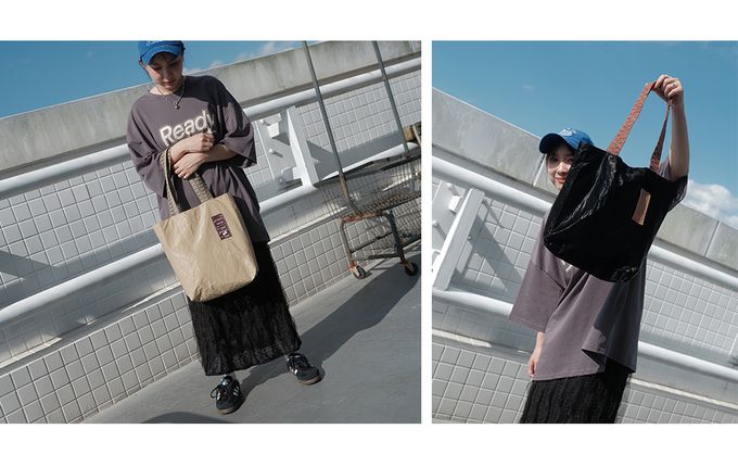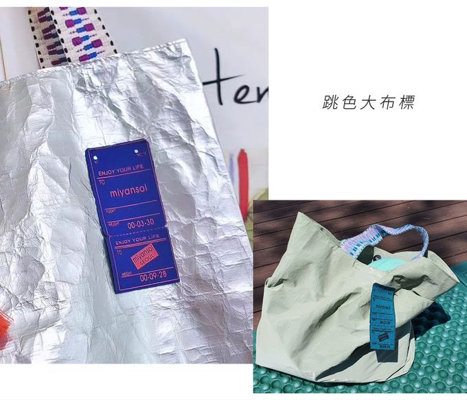 提袋上縫製跳色大布標,是品牌的招牌特色,
