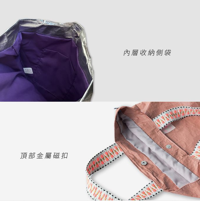 頂部有金屬磁扣防掉物,內層收納側袋好拿小物
