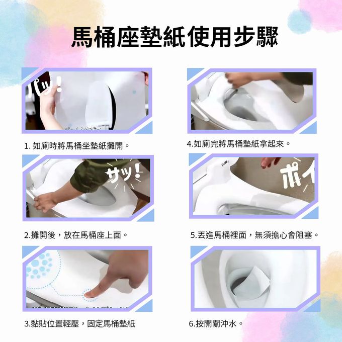 • 使用方式:1. 抽取座墊紙,然後攤開 2. 將座墊紙攤平鋪於馬桶上 3. 座墊紙左右兩側都有黏貼處,輕壓固定 4. 如廁完畢,將馬桶座墊紙拿起 5. 隨手丟進馬桶裡面,隨著水流沖掉