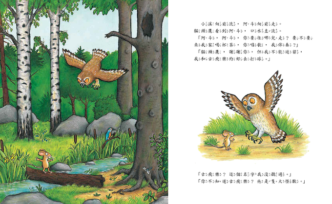 小老鼠阿斗在黑森林散步,遇見狐狸、貓頭鷹和蛇,他們全都想把阿斗吞下肚!聰明的阿斗趕緊告訴他們:怪獸「古飛樂」馬上會出現,而且古飛樂最愛吃烤狐狸肉、燒鳥頭和炒蛇肉!阿斗成功嚇跑了他們,得意的說:「哪有這種大怪獸!」沒想到,古飛樂竟然真的出現了……該怎麼辦?阿斗還有什麼錦囊妙計呢?