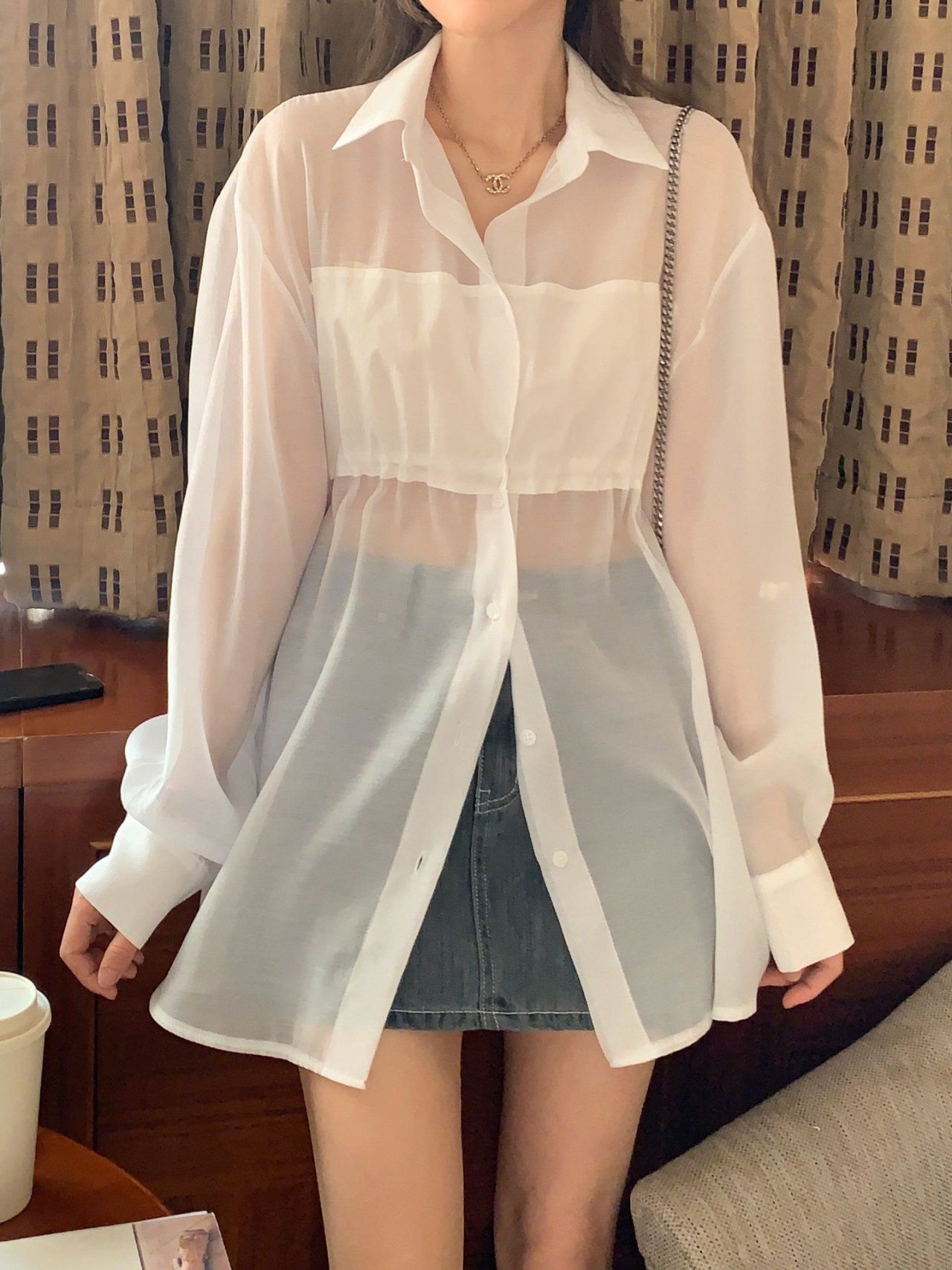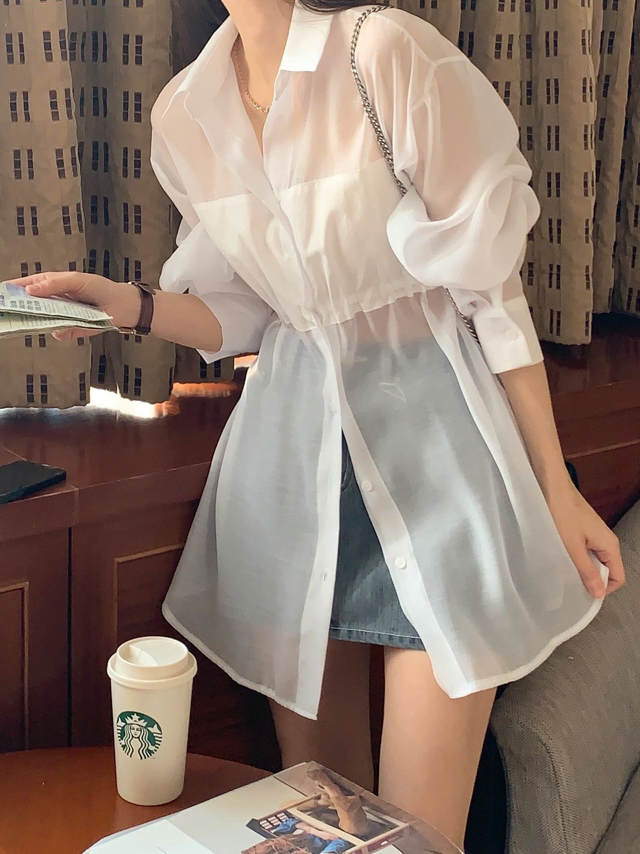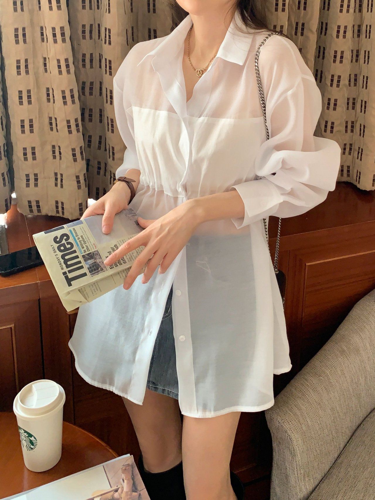 韓國女裝連線 - 透膚雪紡長版襯衫/外套