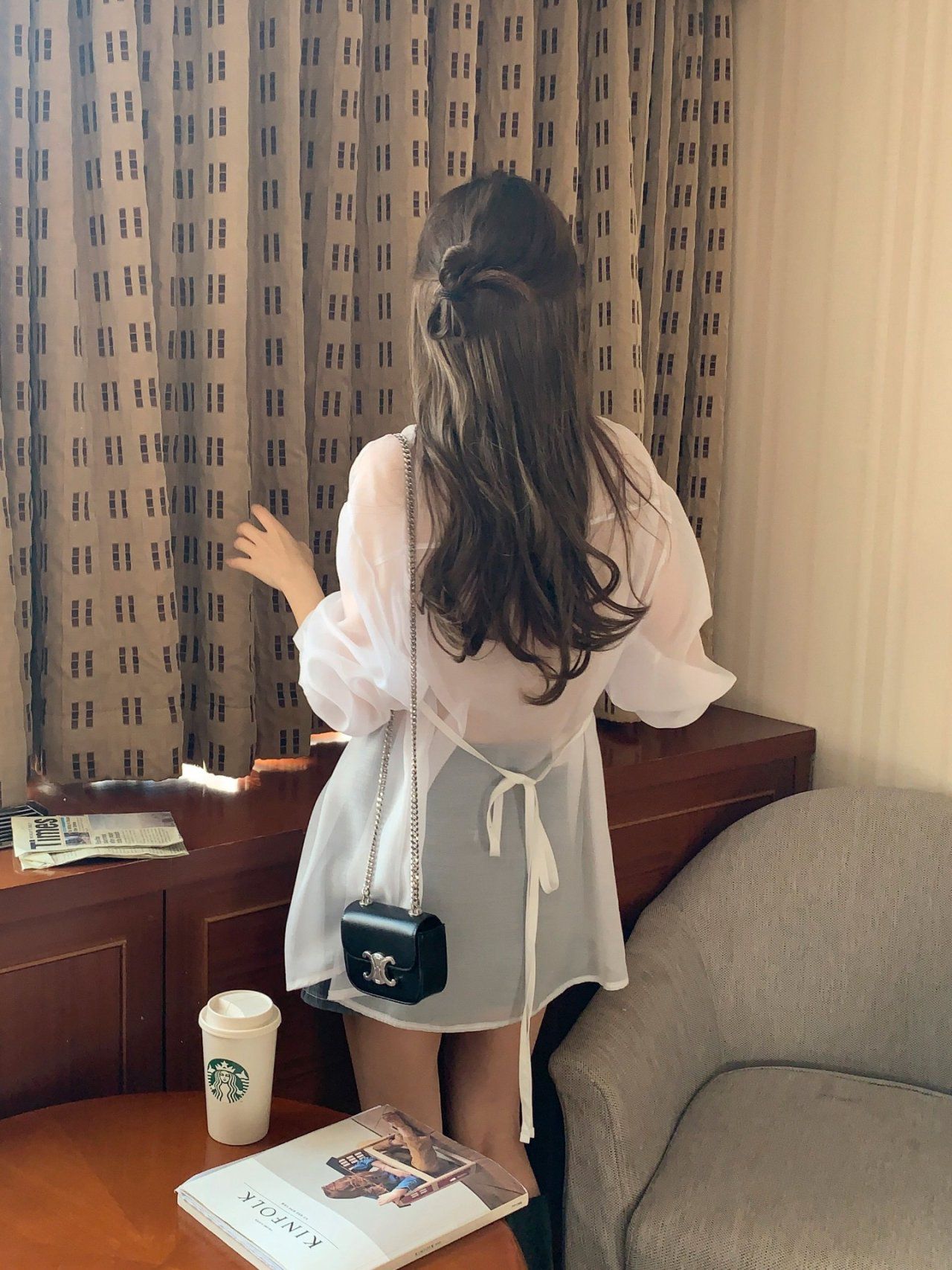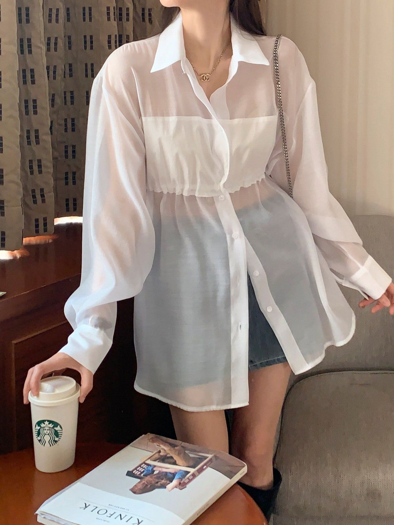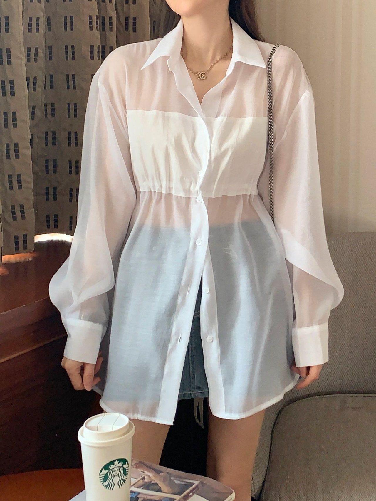 韓國女裝連線 - 透膚雪紡長版襯衫/外套
