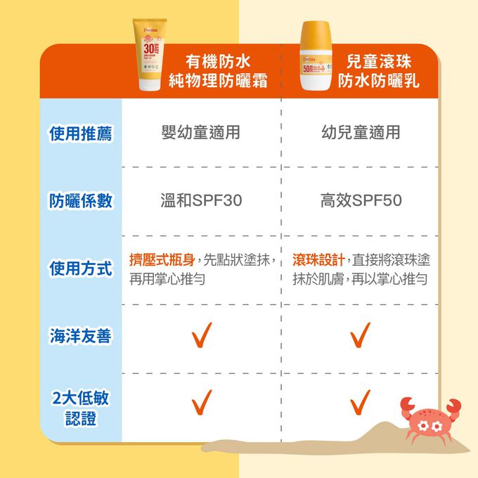 丹麥消委會評鑑最優等,100%無香、0色素、0香精,溫和防曬,好塗抹又可降低易敏不適機率,超防水、好清潔,定量滾珠式設計,適合小孩自己塗抹防曬霜,4項國際認證 (2低敏認證/北歐白天鵝/英國純素)