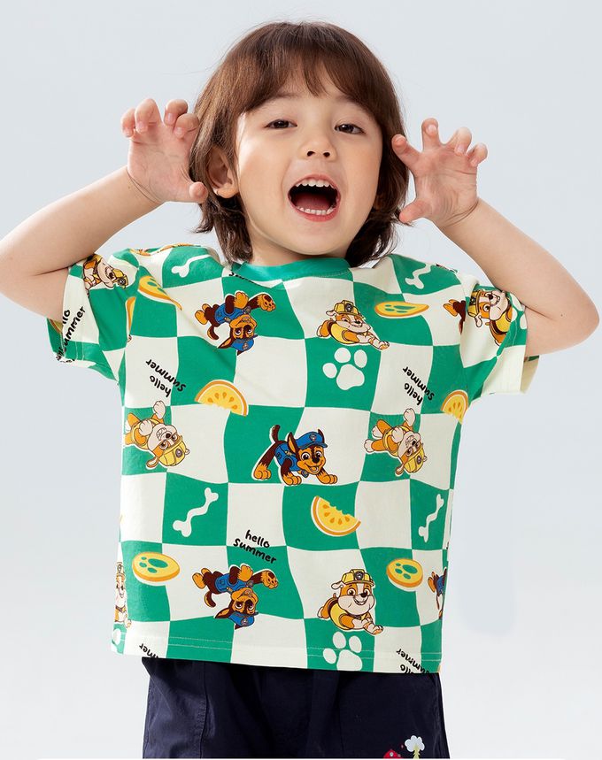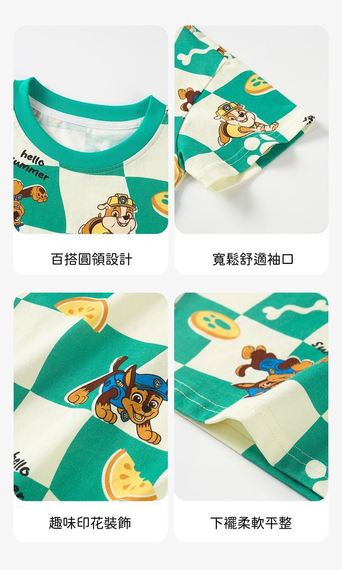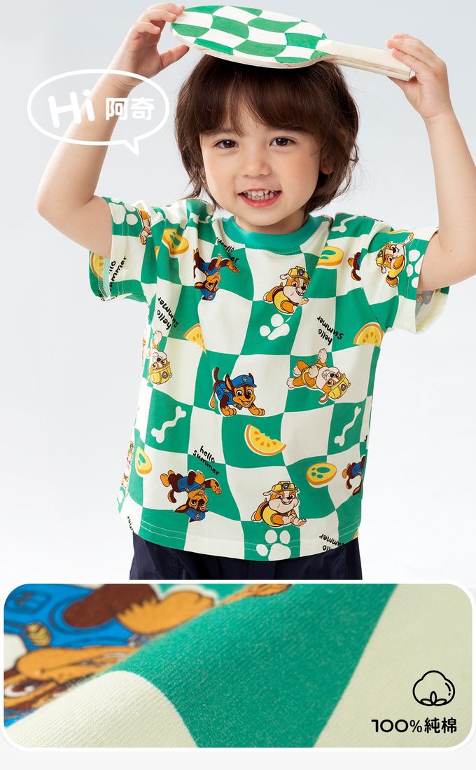 卡通汪汪隊純棉格子印花圓領短袖上衣-卡通人物阿奇-綠色