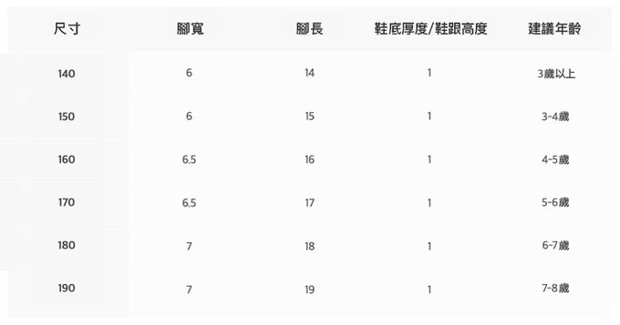 2. 每個尺寸的建議年齡、建議身高僅供參考,每位孩子發育狀況各有不同,建議參考寶貝現有的鞋子尺寸做對照。