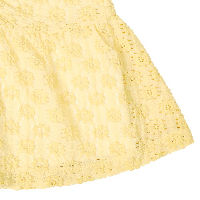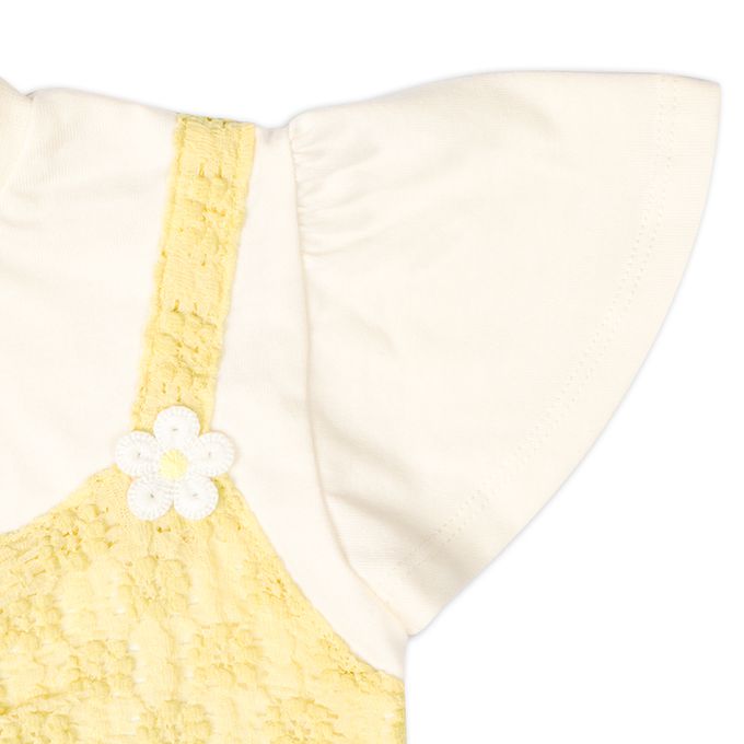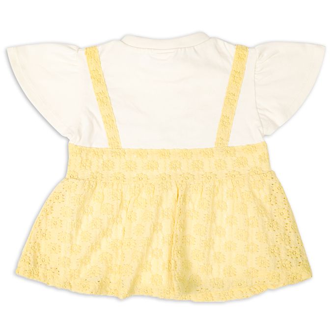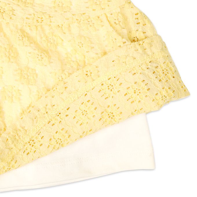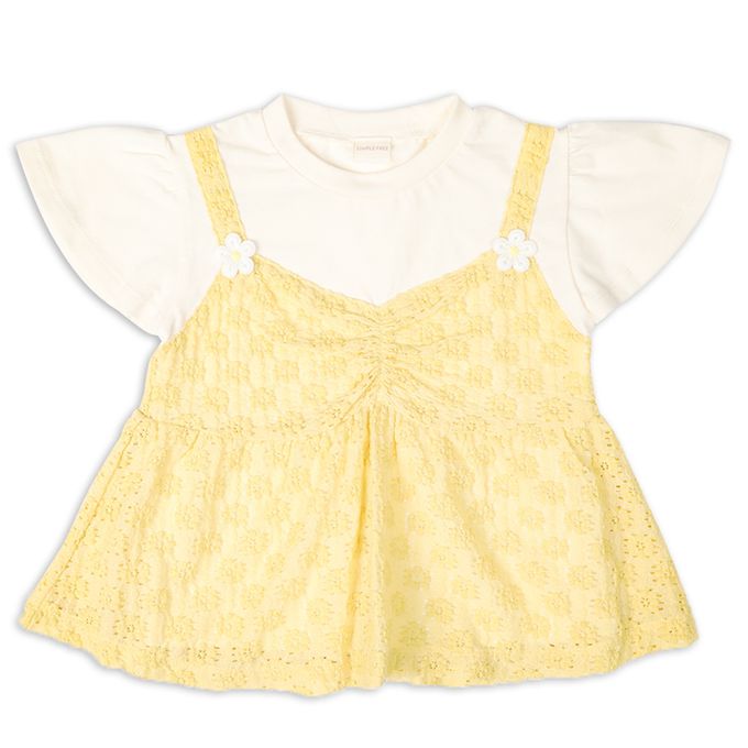 營造出在有小花圖案的緹花材質無袖上衣裡疊穿一件T恤的效果,單穿也很亮眼。