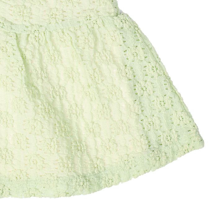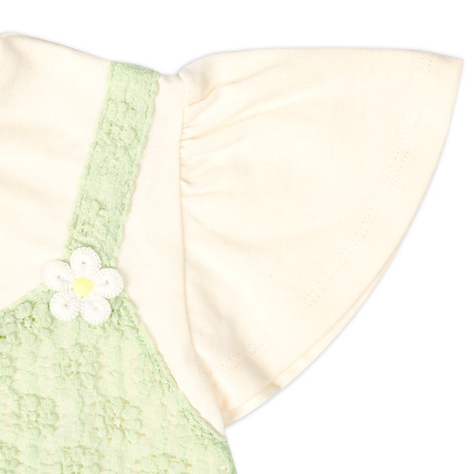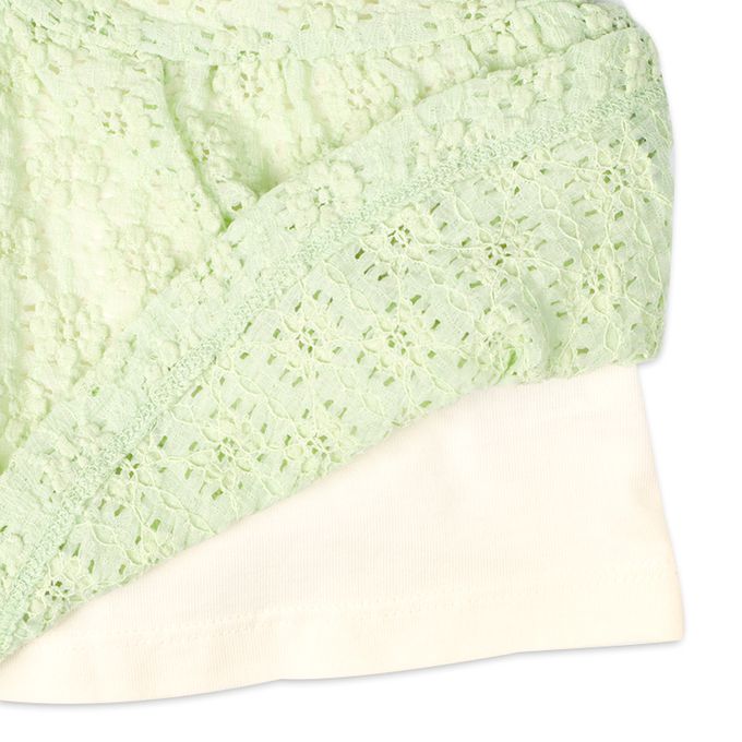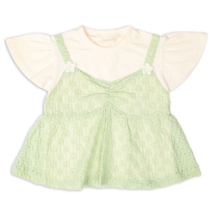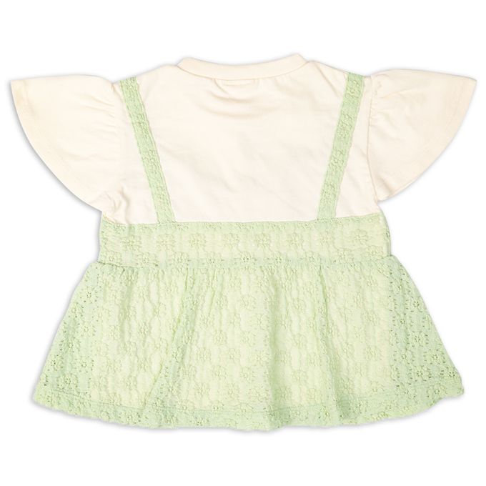 營造出在有小花圖案的緹花材質無袖上衣裡疊穿一件T恤的效果,單穿也很亮眼。