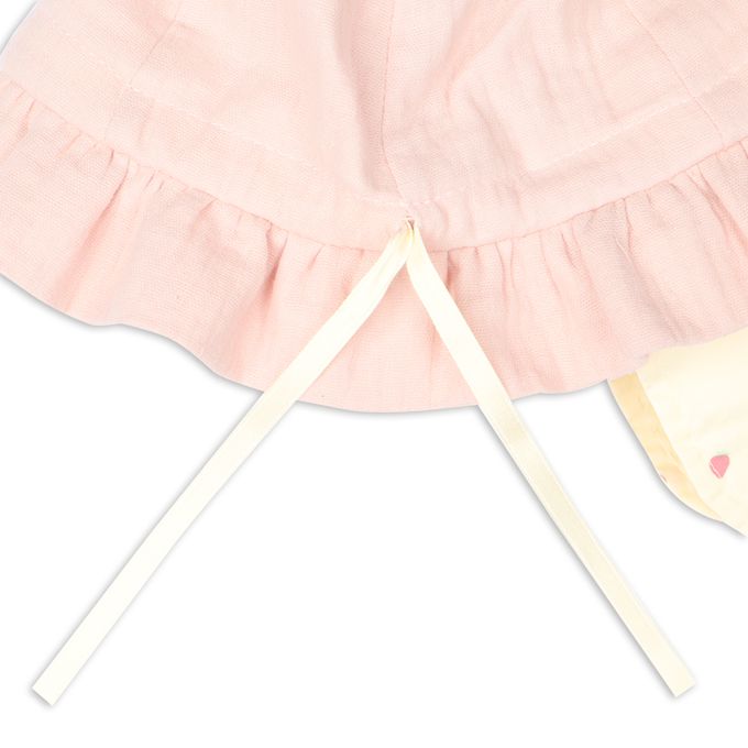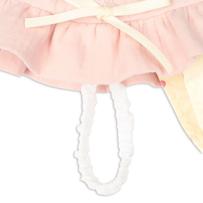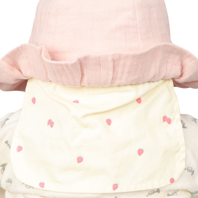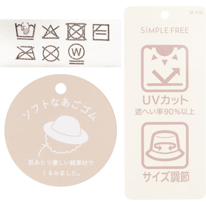 下巴有鬆緊帶可防止被風等吹落。下巴鬆緊帶用布料裹住,使膚觸更舒適。