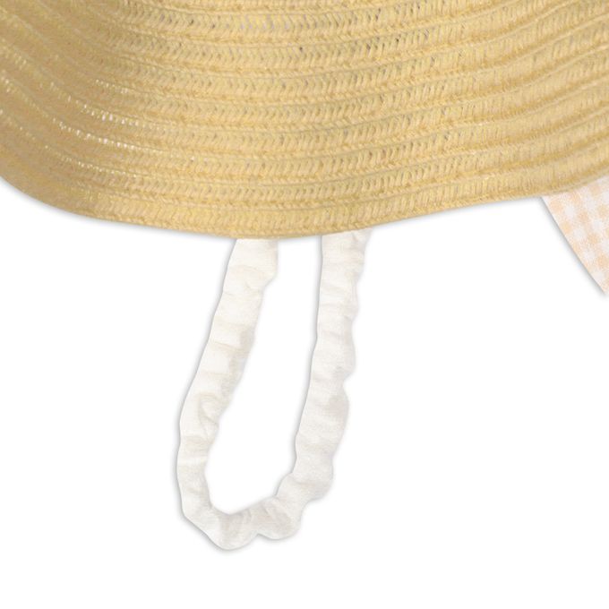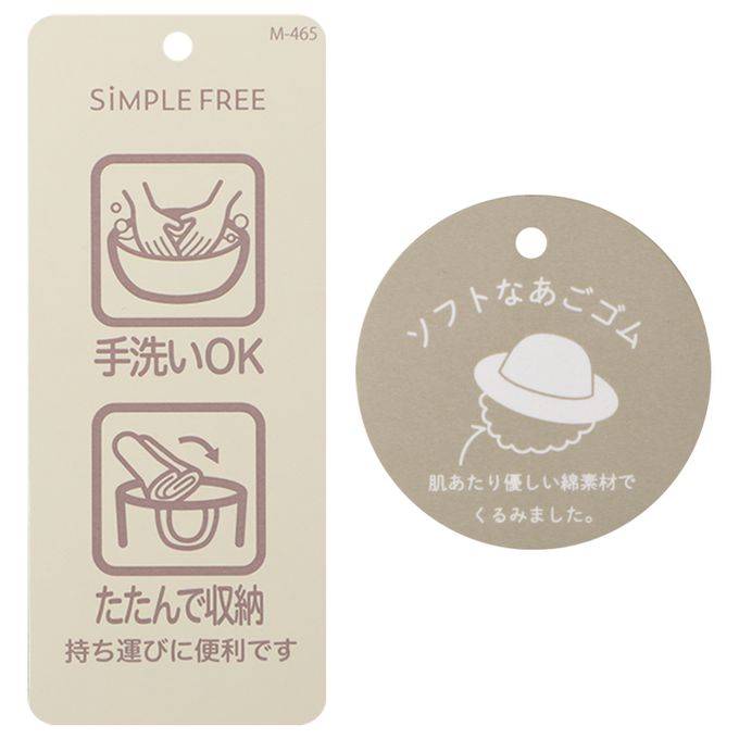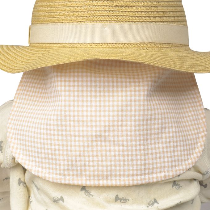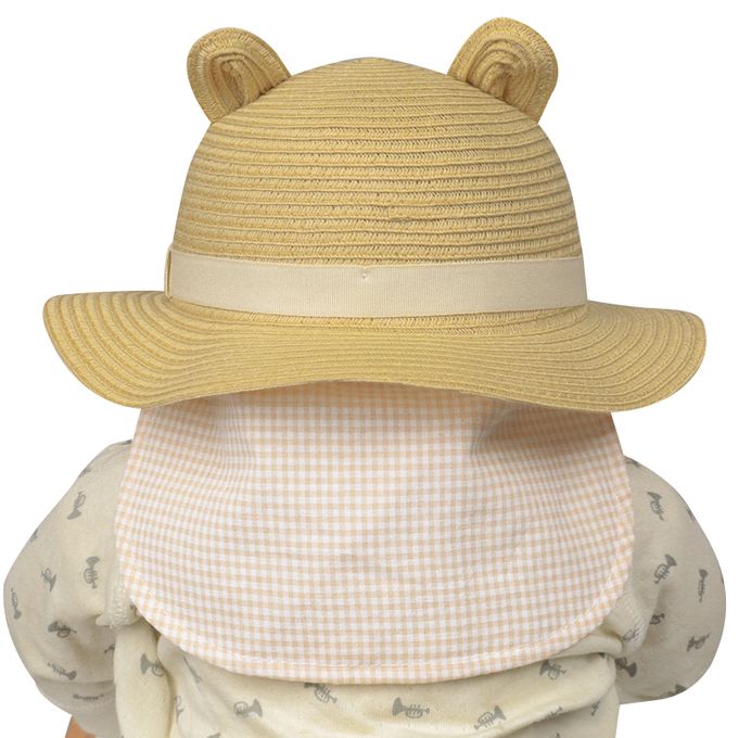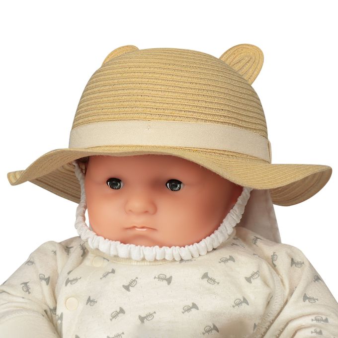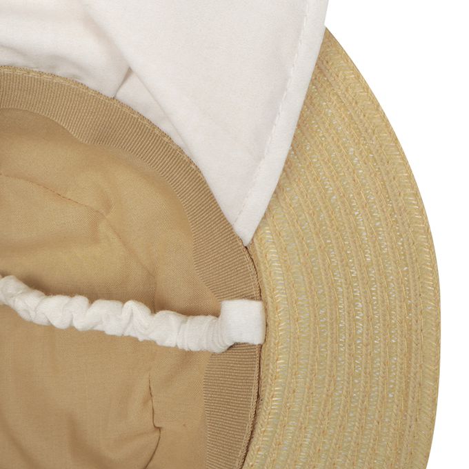 有附外出活動時非常需要的防曬遮陽布。下巴有鬆緊帶可防止被風等吹落。下巴鬆緊帶用布料裹住,使膚觸更舒適。